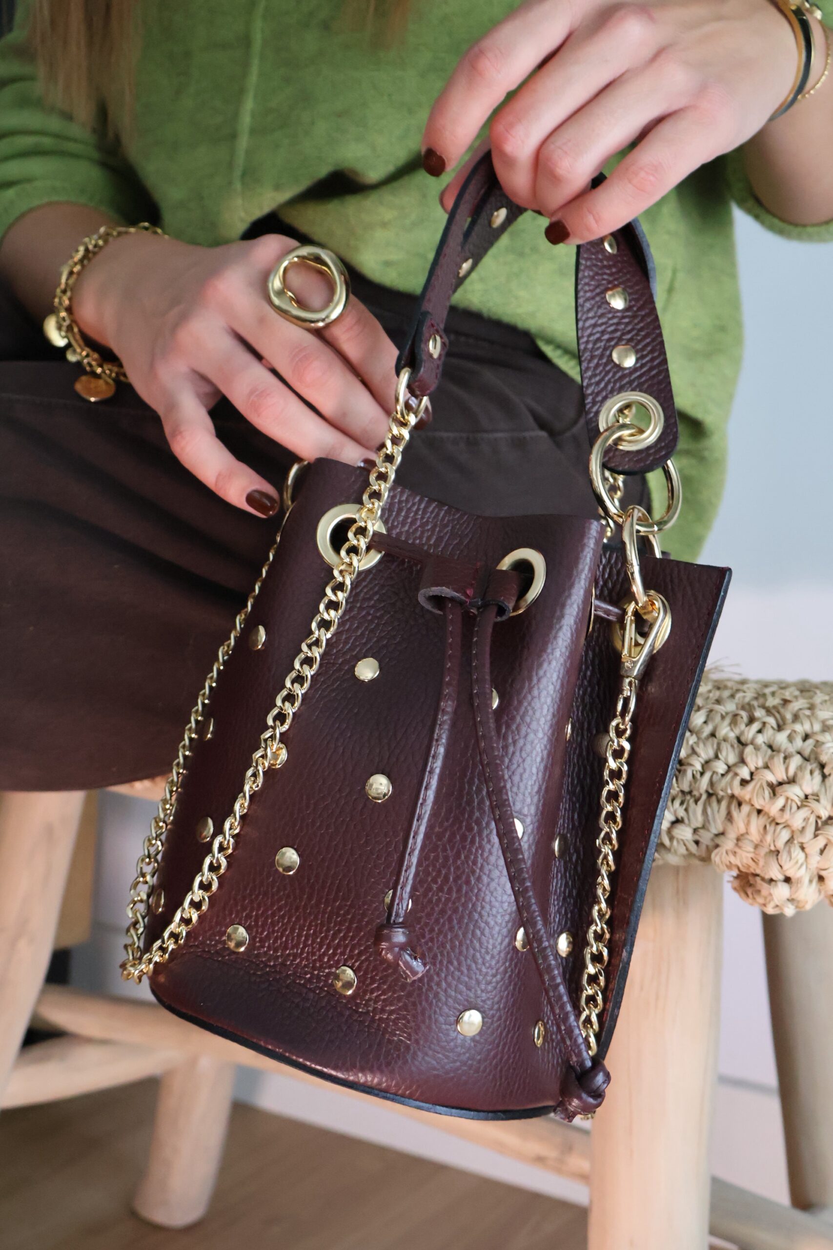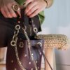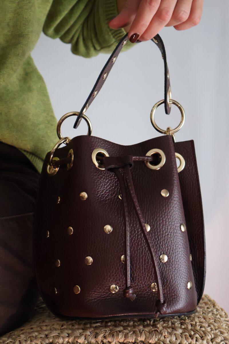 Bolso bombonera con detalle de tachuelas. Asa corta de mano y opción de asa larga de cadena (no regulable). Cierre en cordón ajustable.