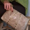 Bolso piel con tachuelas doradas. Cierre de cremallera. Opción de dos correas para colgar, una corta y otra larga ajustable. Bolsillo interior con cremallera.