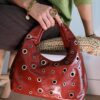 Bolso polipiel de arandelas en color bronce. Asa de mano no regulable acolchada, con opción de correa larga ajustable cogida a los laterales. Cierre de cremallera y dos bolsillos interiores, uno con cremallera y otro abierto.