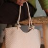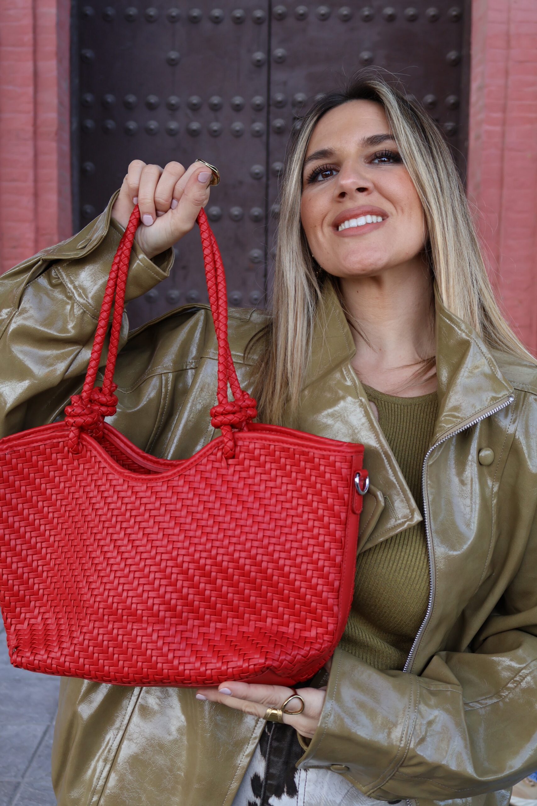 Bolso trenzado en color rojo. Asa de mano/hombro no regulable con opción de asa larga regulable. Sin cierre, interior no forrado con neceser pequeño con cremallera.