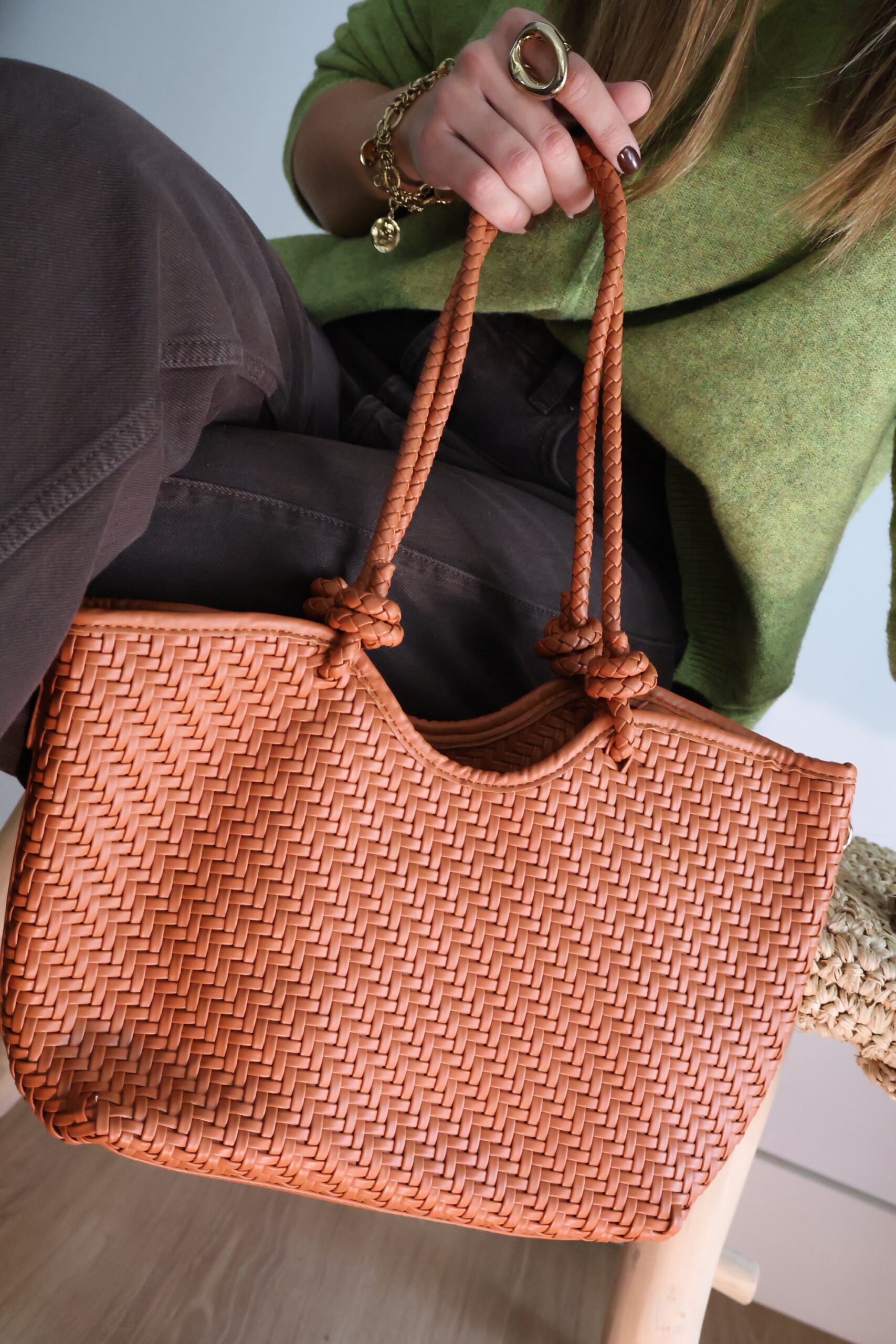 Bolso trenzado en color teja. Asa de mano/hombro no regulable con opción de asa larga regulable. Sin cierre, interior no forrado con neceser pequeño con cremallera.