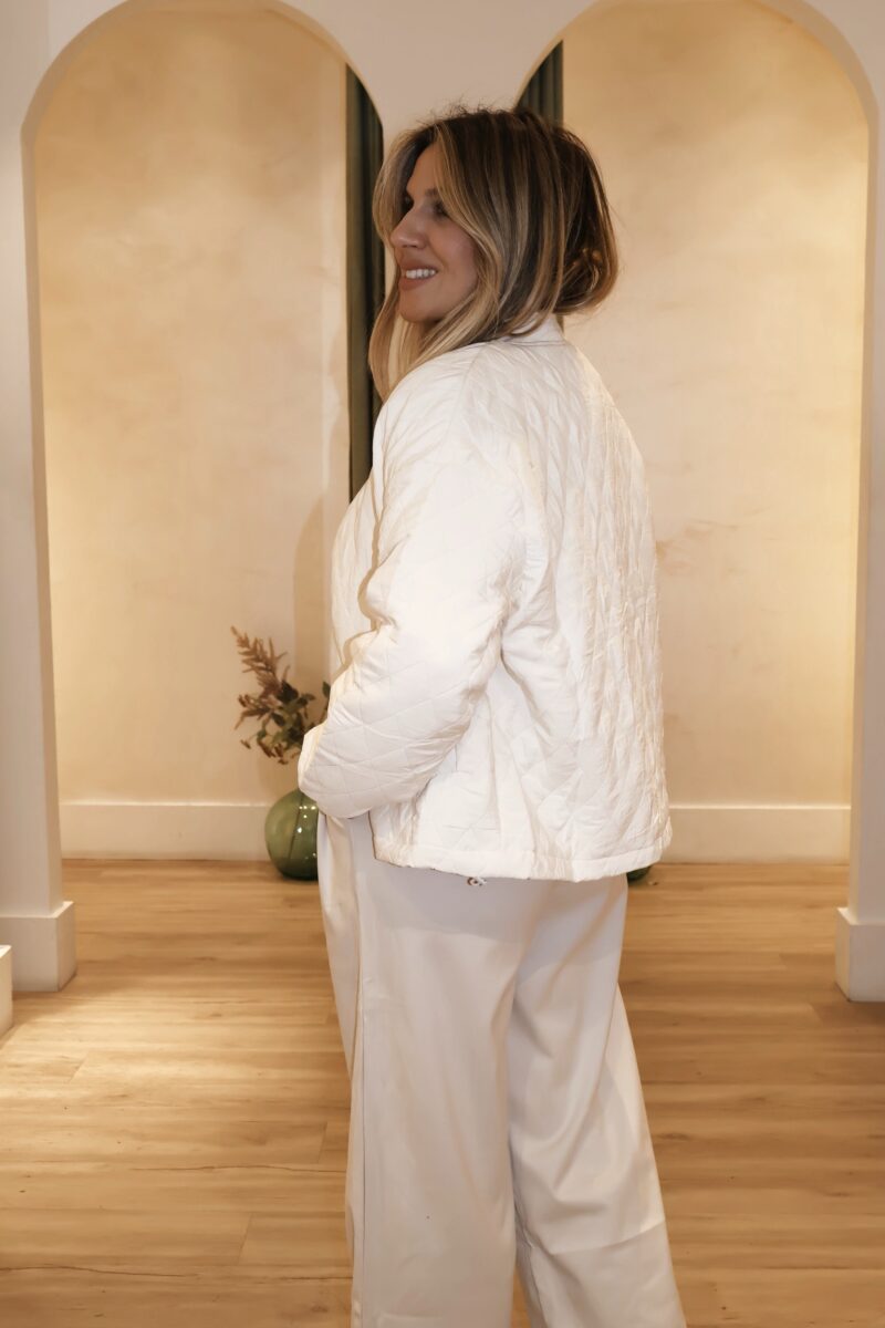 Bomber efecto acolchado, cuello a la caja. Cierre con botones de click. Puño con frunce elástico y bolsillos laterales.