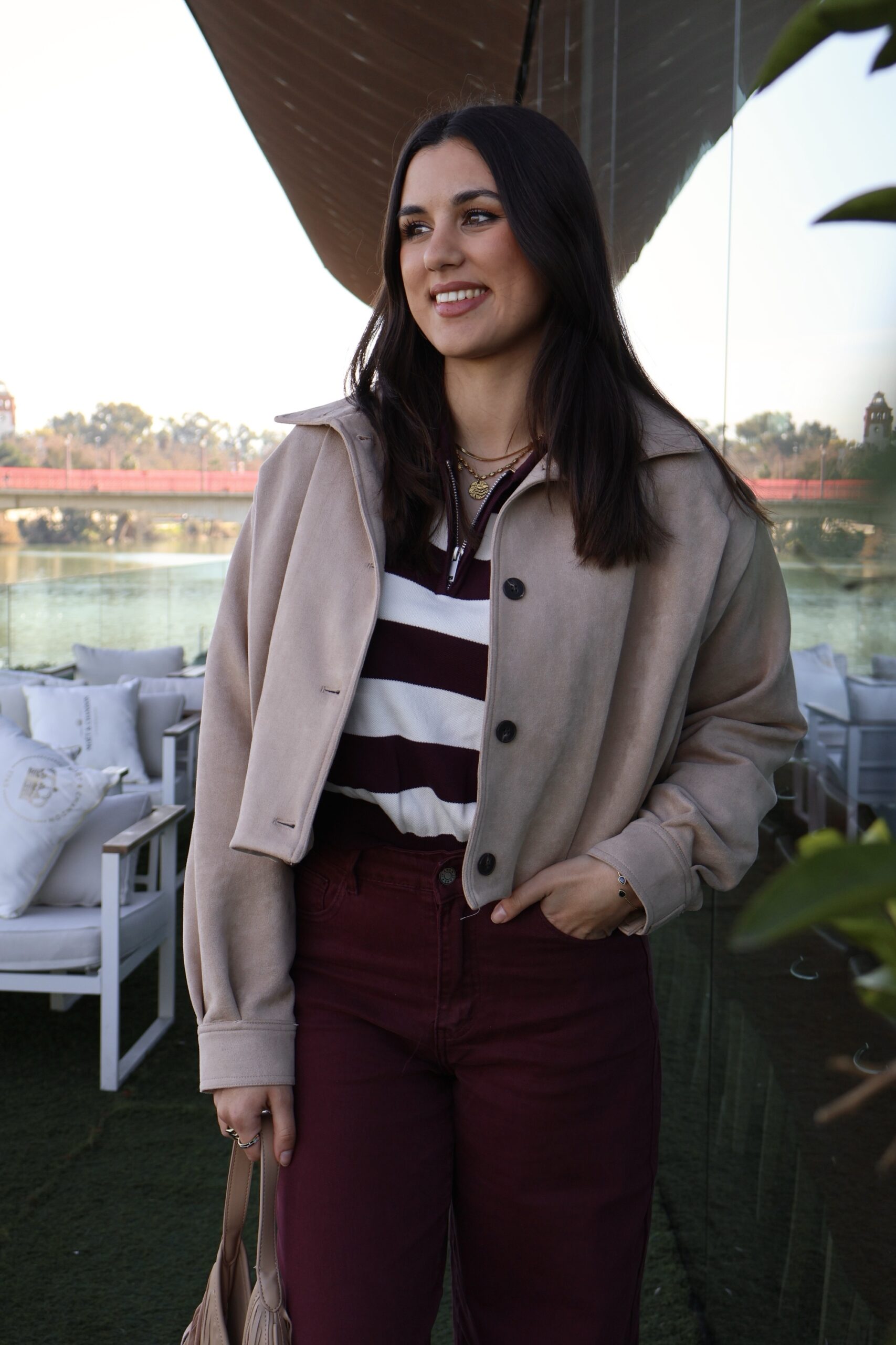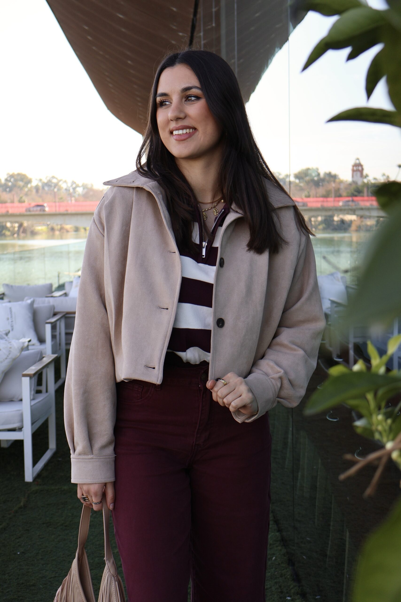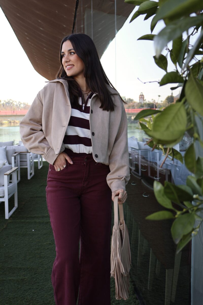 Bomber efecto antelina. Cierre frontal de botones, cuello adaptable que puede llevarse abierto o cerrado hasta arriba. Puños con cierre de botón.