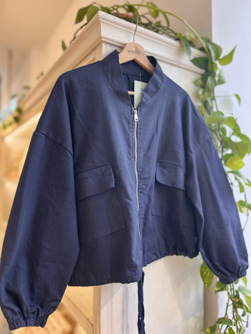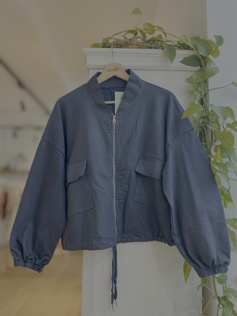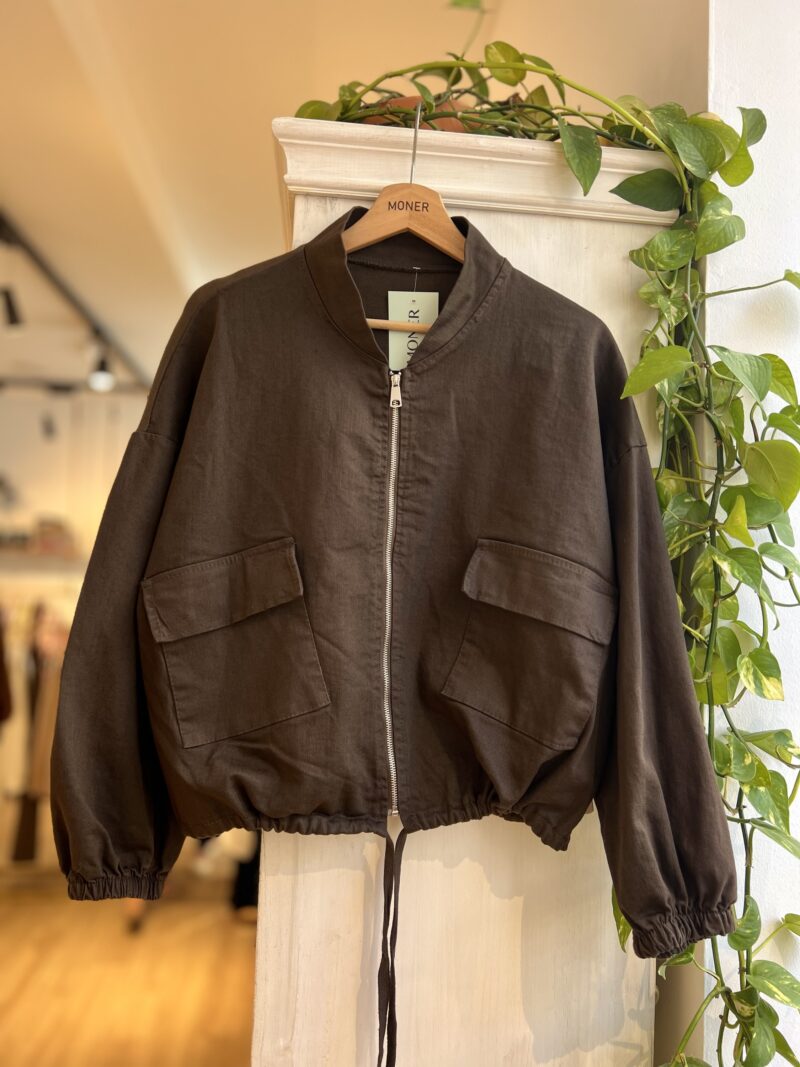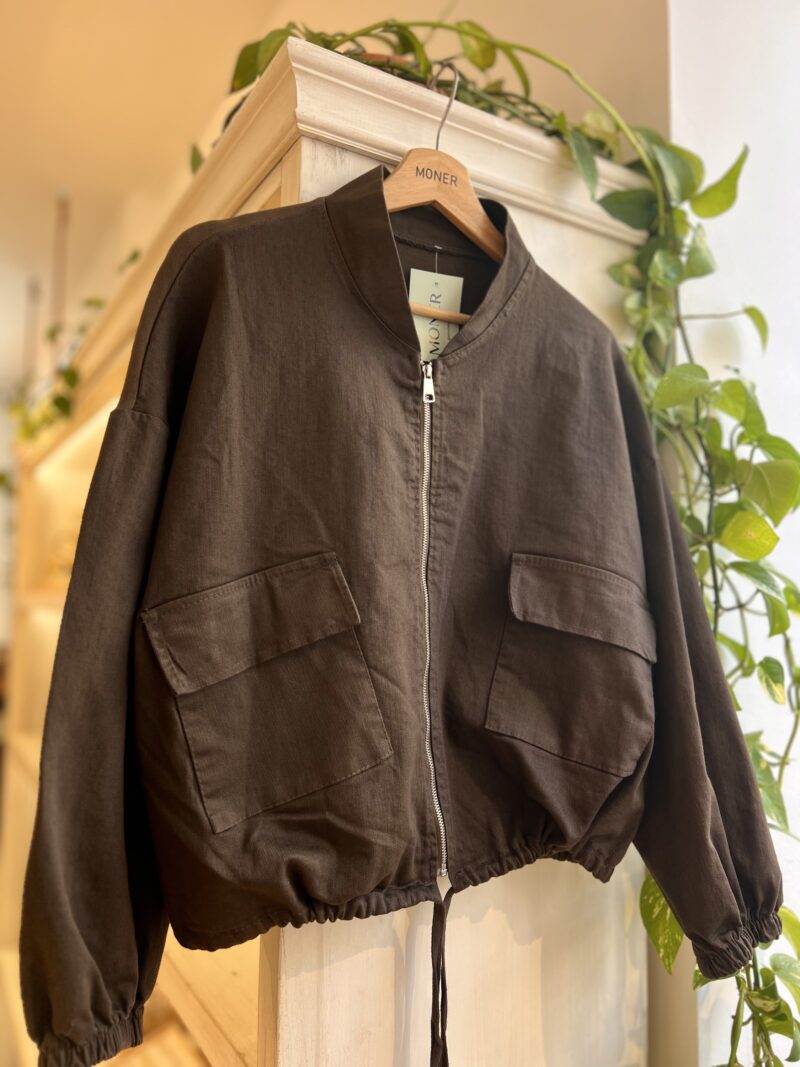 Bomber con cierre de cremallera y bolsillos delanteros. Cordón bajo ajustable.