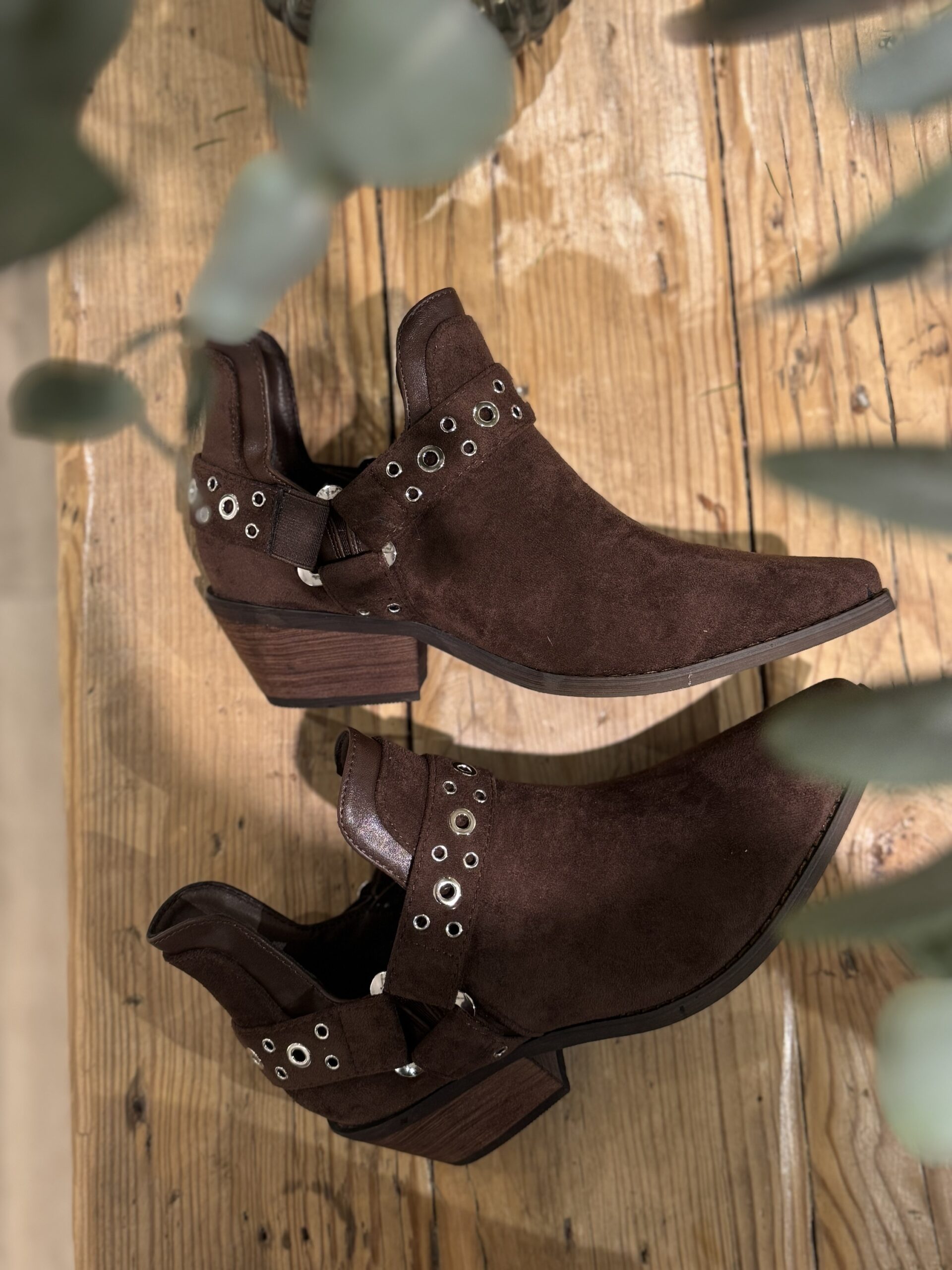 Botín marrón con detalle de hebilla. Puntera fina, tacón bajo efecto madera. Diseño cómodo.