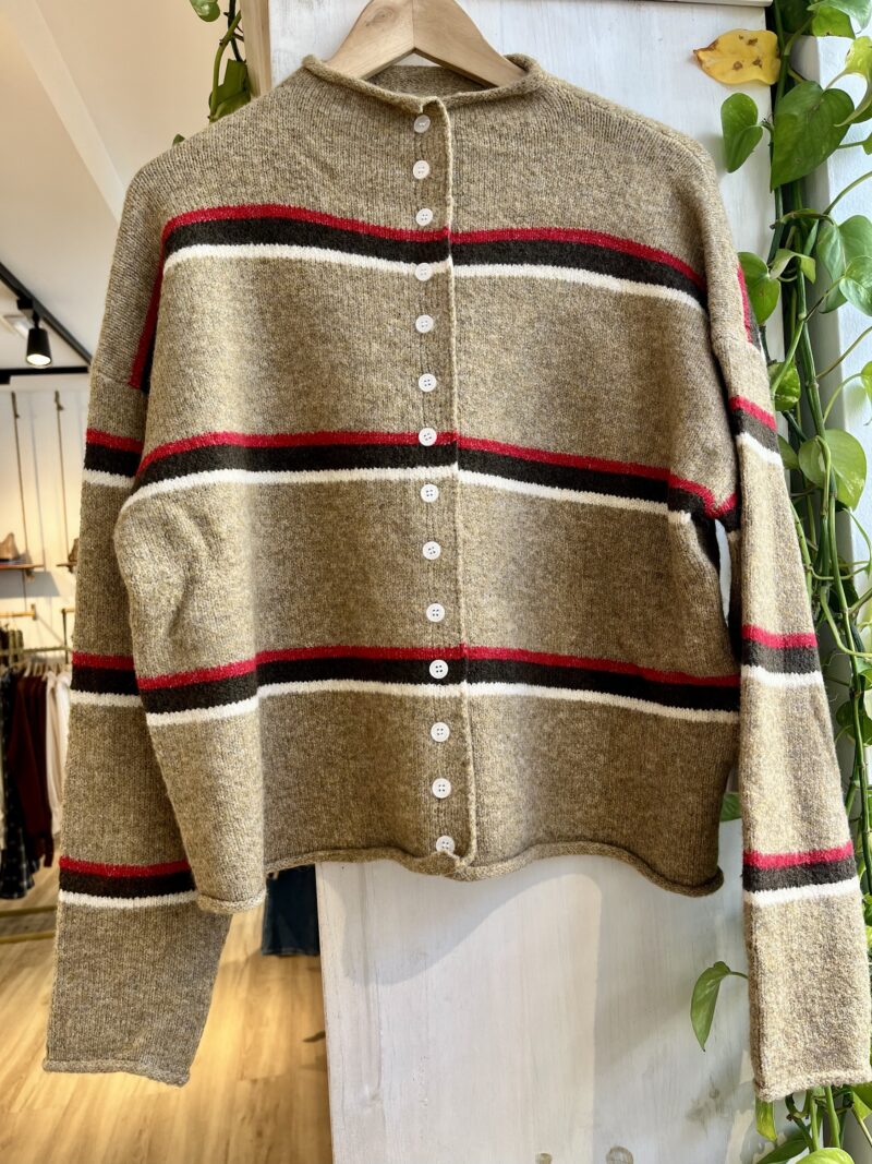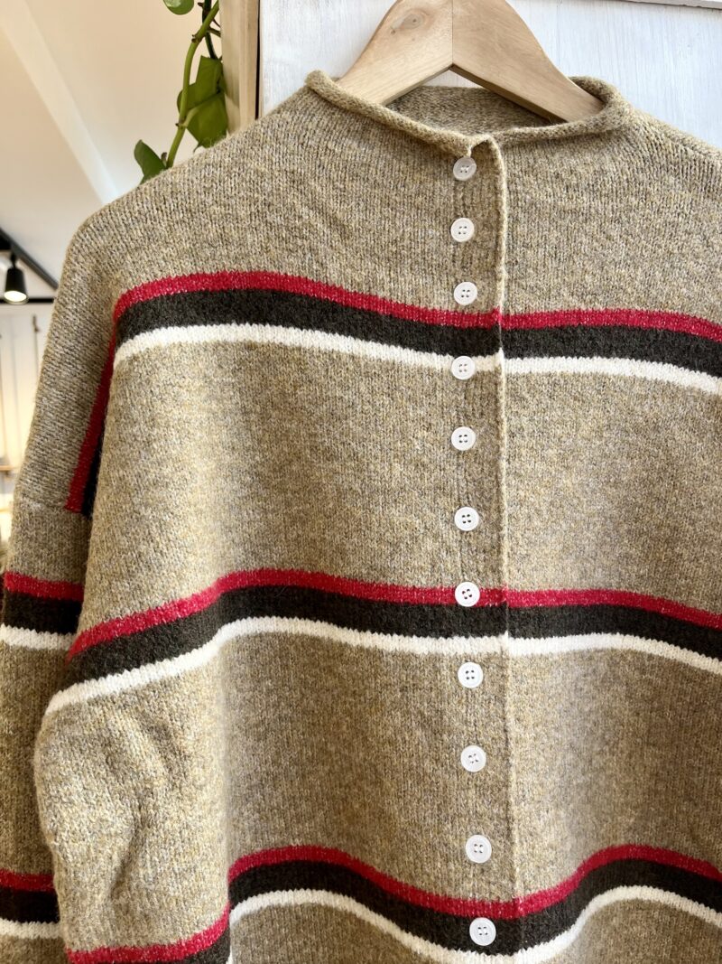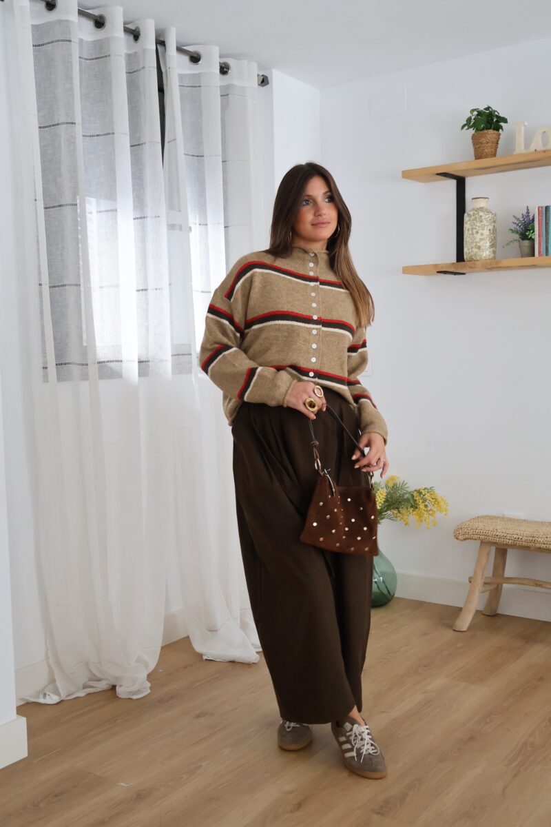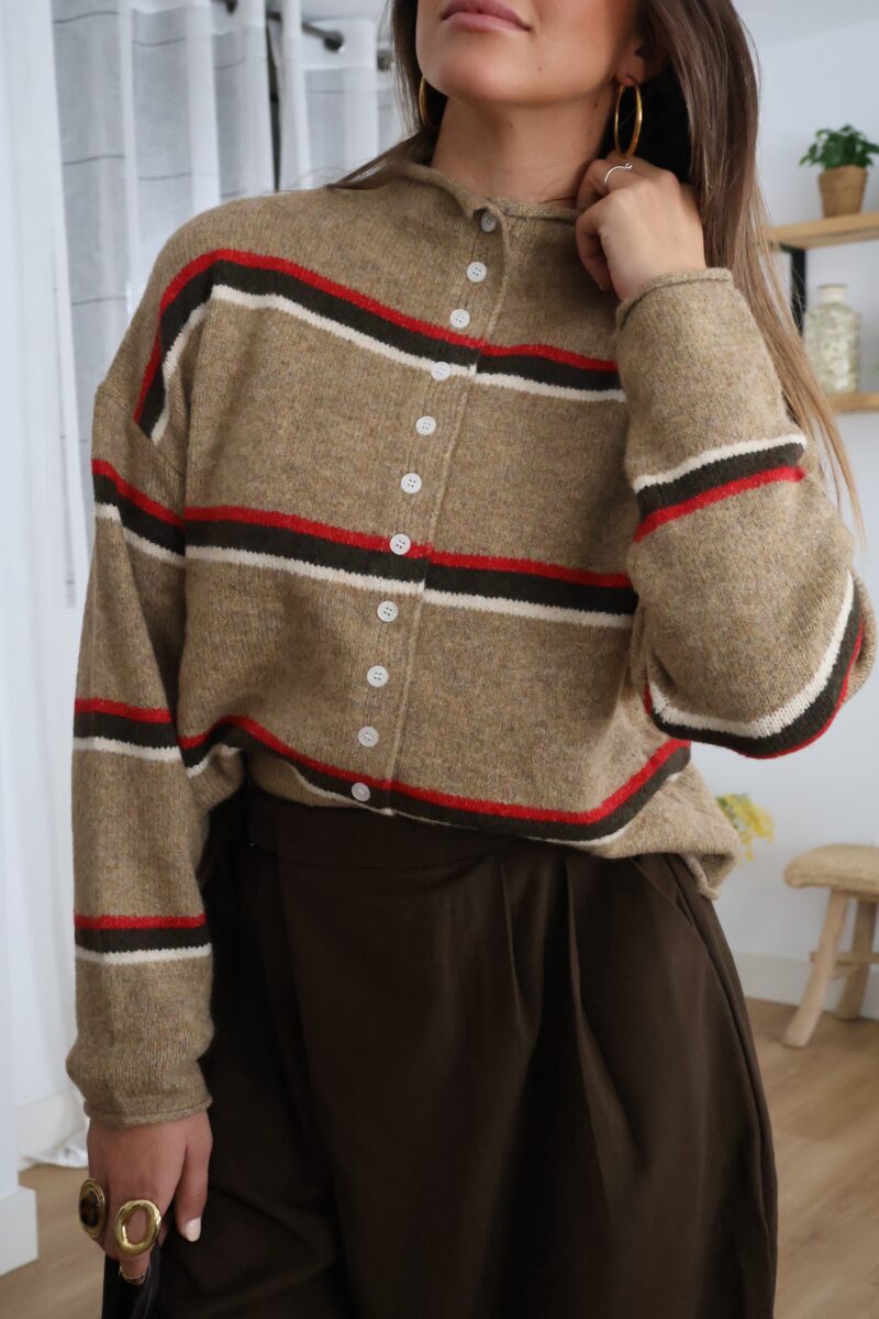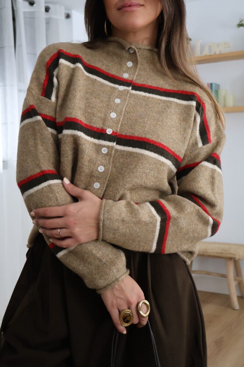 Jersey tipo cárdigan de punto suave en tono camel con franjas en negro, blanco y rojo. Su diseño con botones en la parte trasera le da un toque original y versátil: puedes llevarlo con los botones hacia atrás o al frente según el estilo que prefieras. Corte recto, cuello subido y tejido cálido ideal para los días frescos. Perfecto para combinar con jeans, faldas o pantalones de vestir.