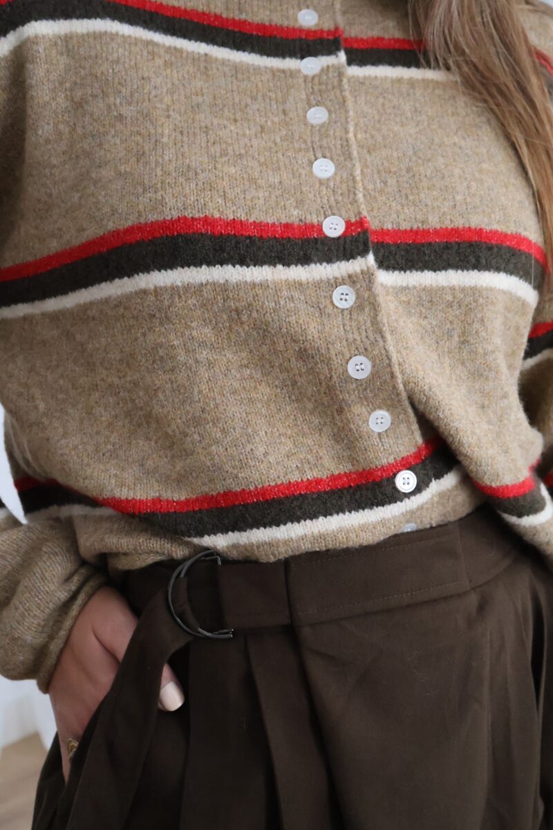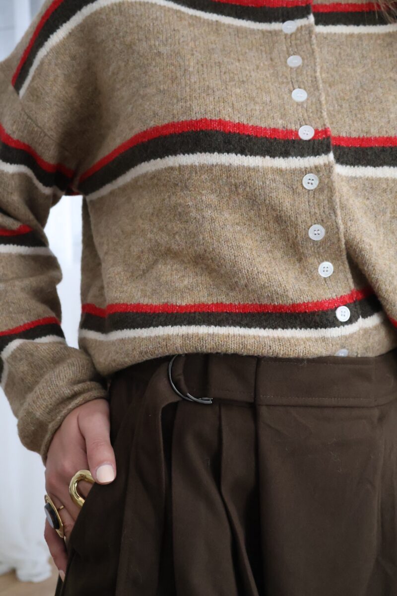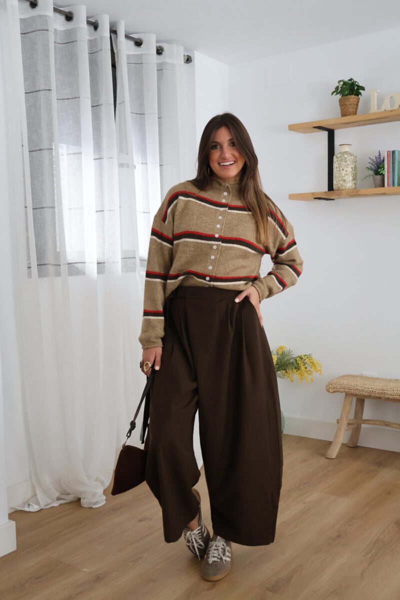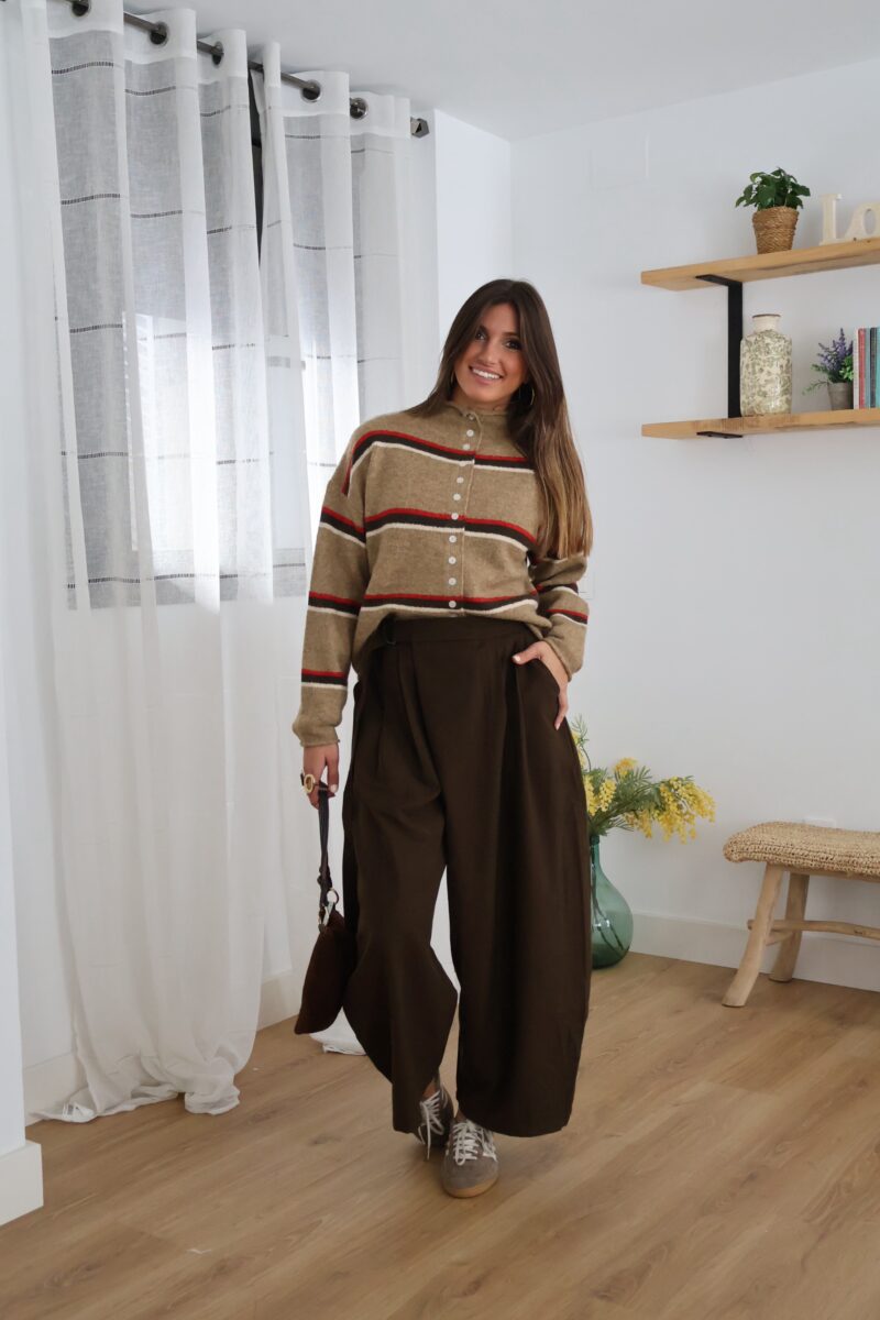 Jersey tipo cárdigan de punto suave en tono camel con franjas en negro, blanco y rojo. Su diseño con botones en la parte trasera le da un toque original y versátil: puedes llevarlo con los botones hacia atrás o al frente según el estilo que prefieras. Corte recto, cuello subido y tejido cálido ideal para los días frescos. Perfecto para combinar con jeans, faldas o pantalones de vestir.