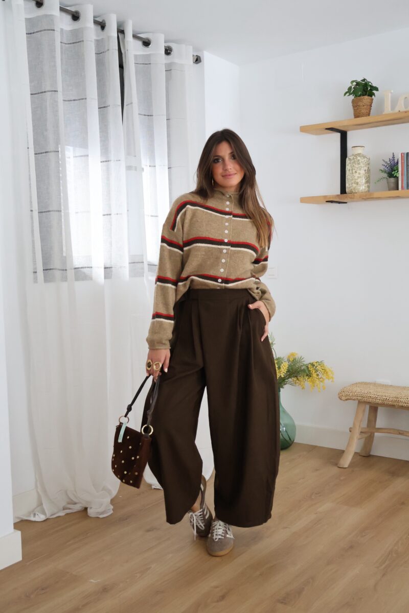 Jersey tipo cárdigan de punto suave en tono camel con franjas en negro, blanco y rojo. Su diseño con botones en la parte trasera le da un toque original y versátil: puedes llevarlo con los botones hacia atrás o al frente según el estilo que prefieras. Corte recto, cuello subido y tejido cálido ideal para los días frescos. Perfecto para combinar con jeans, faldas o pantalones de vestir.