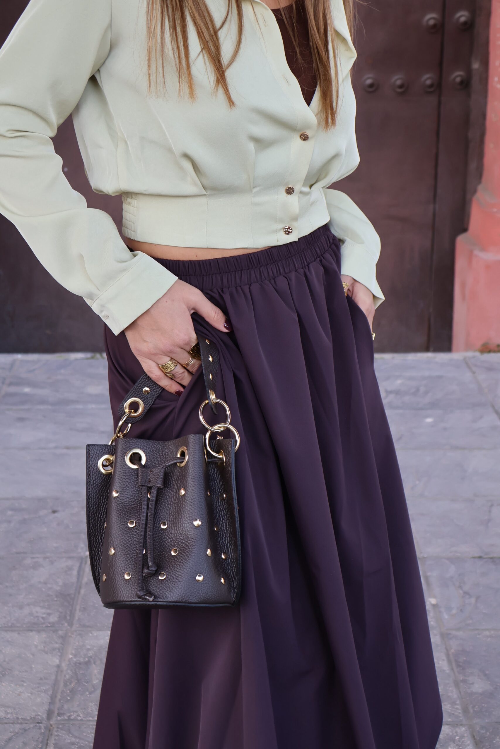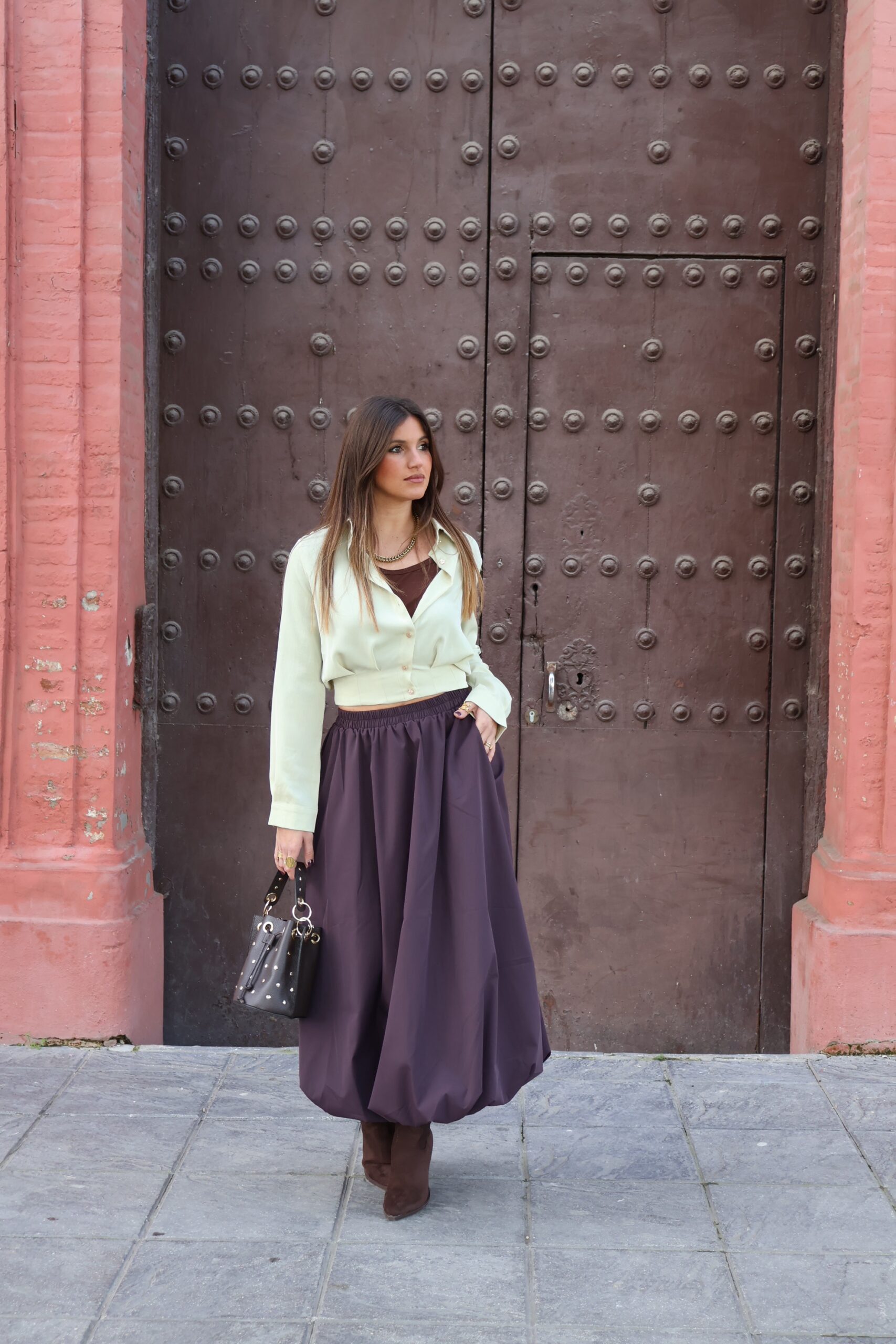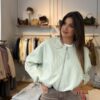 Camisa verde lima con cierre de botones dorados. Hombreras y puños con cierre con un botón dorado. Detalle de terminación en frunce elástico por detrás.