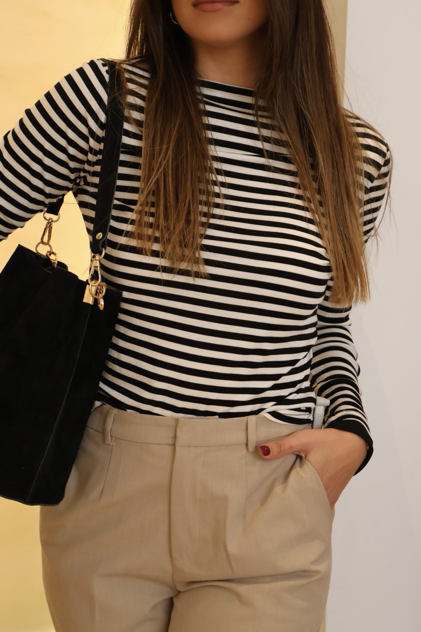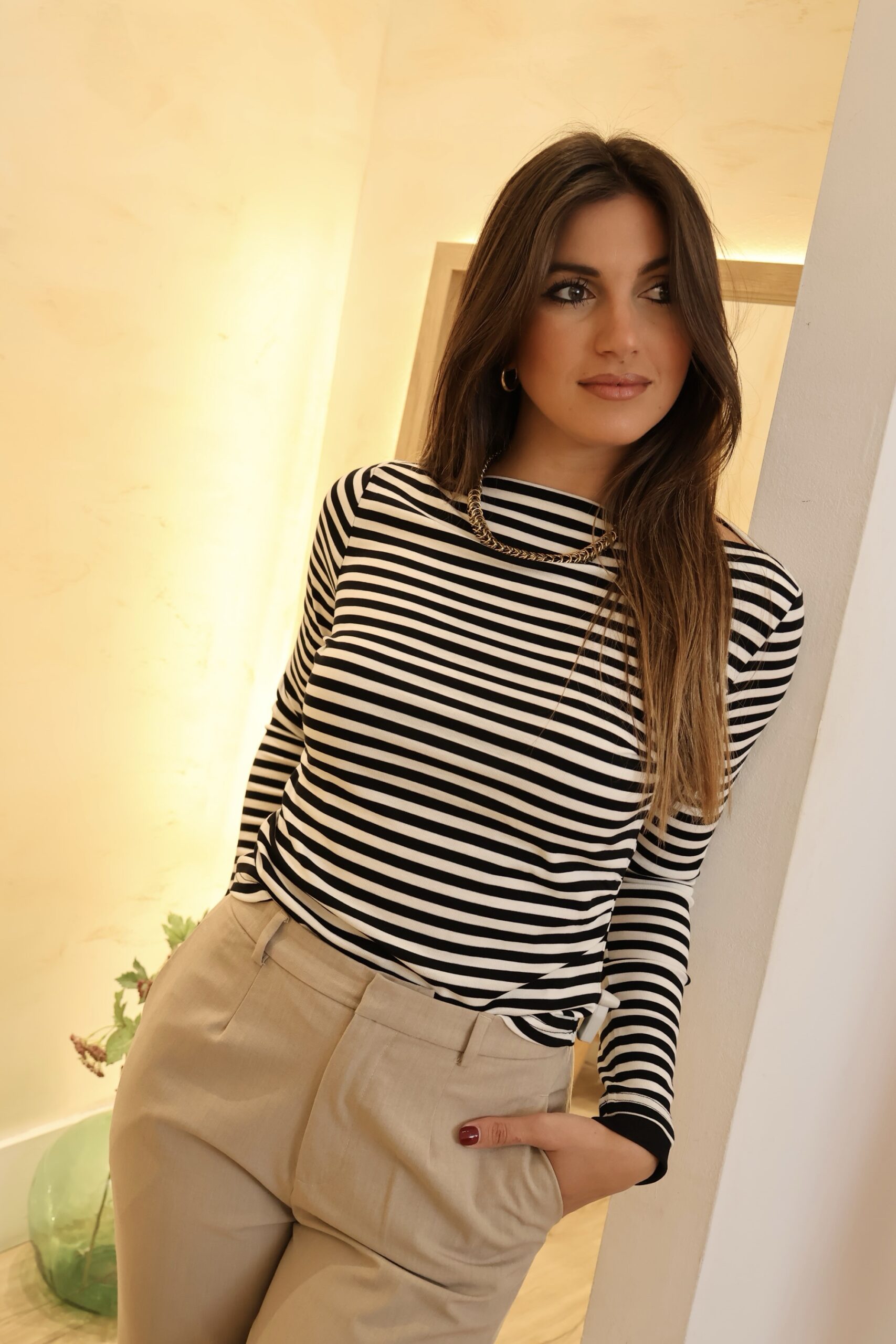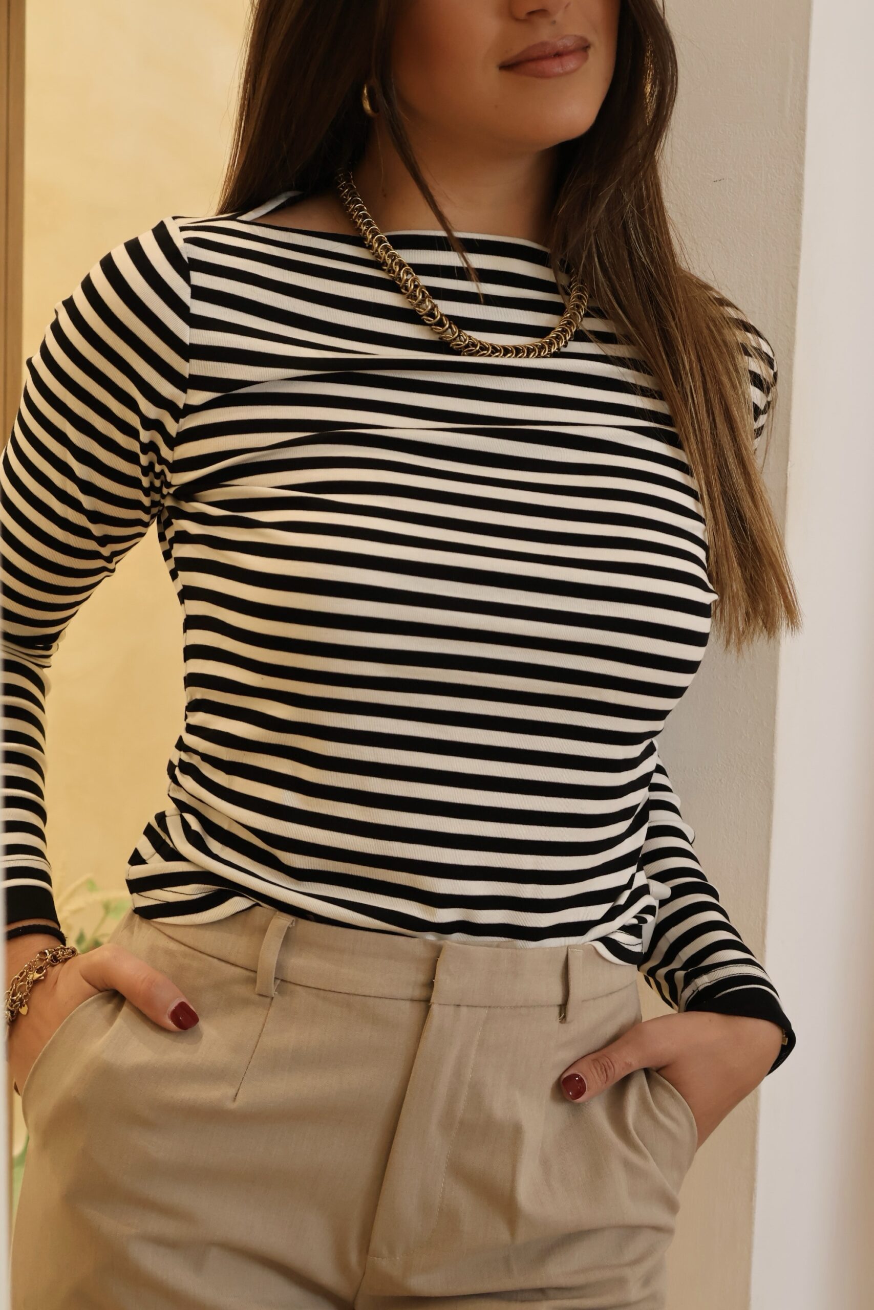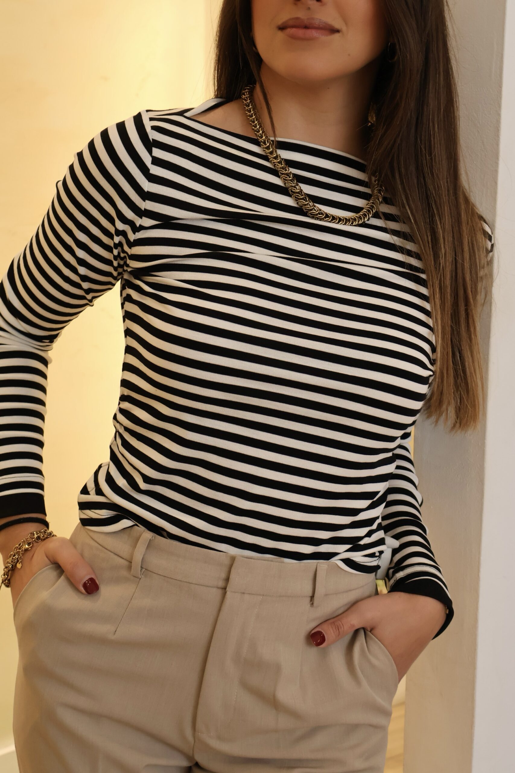Camiseta de rayas blanca y negra de manga larga con cuello de barco.