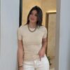 Camiseta confeccionada en tejido suave y elástico en color beige con rayas finas en contraste. Diseño de manga corta con escote redondo y corte recto ligeramente ajustado que se adapta cómodamente a la silueta.