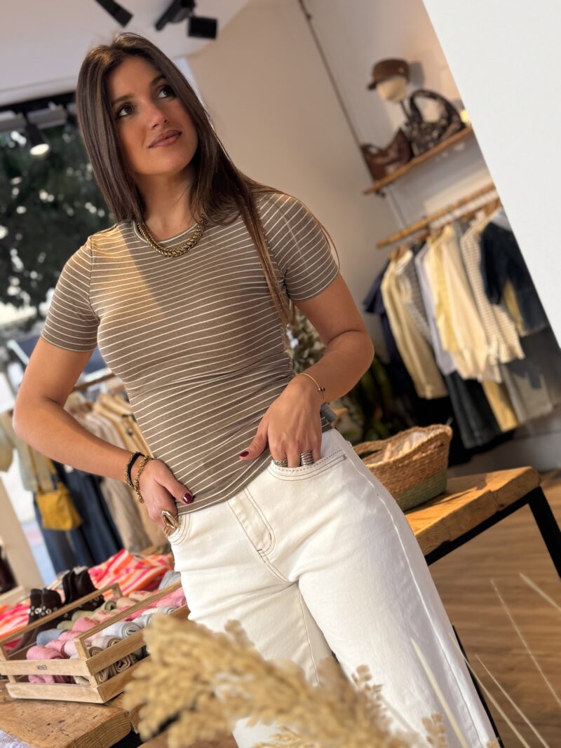 Camiseta confeccionada en tejido suave y elástico en color beige con rayas finas en contraste. Diseño de manga corta con escote redondo y corte recto ligeramente ajustado que se adapta cómodamente a la silueta.