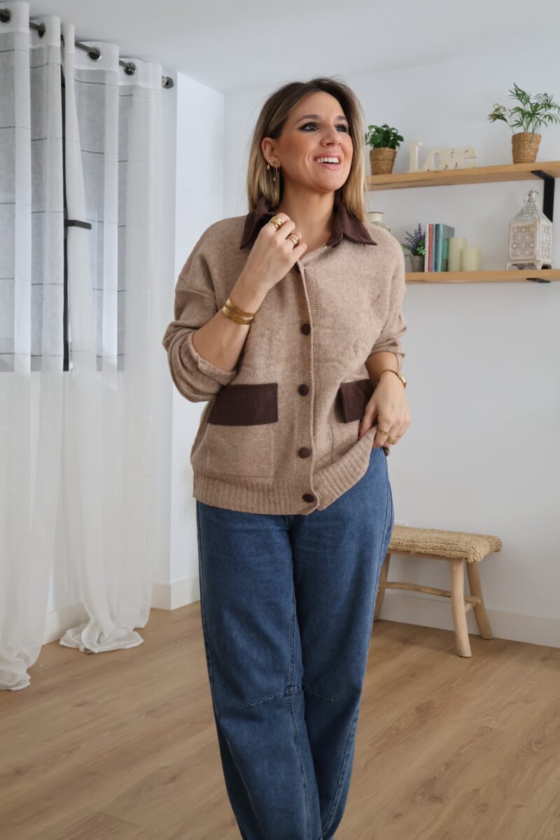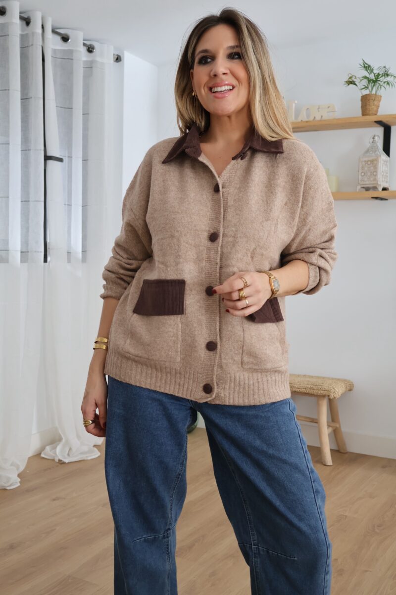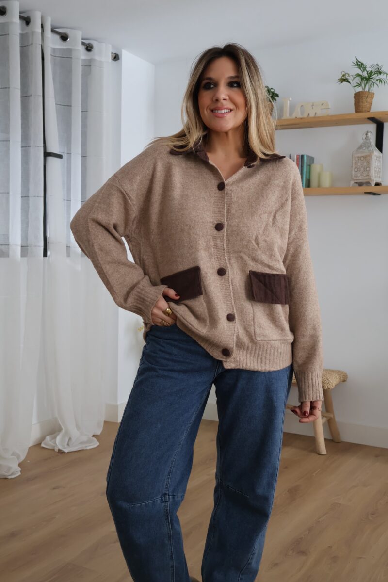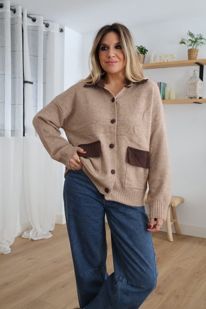 Cárdigan de punto en tono beige con detalles en pana marrón. Diseñado con cuello, botones y bolsillos frontales a contraste. Suave, cómodo y perfecto para un look casual con un toque elegante.