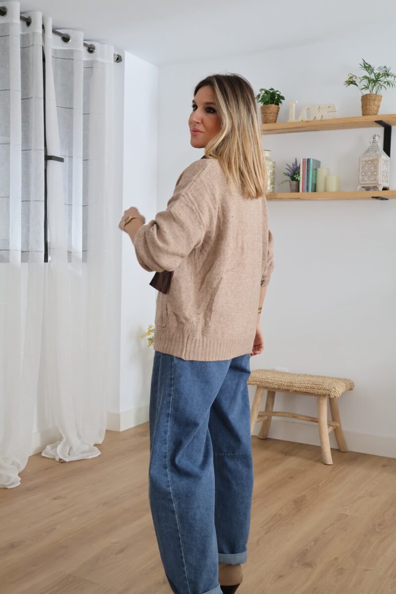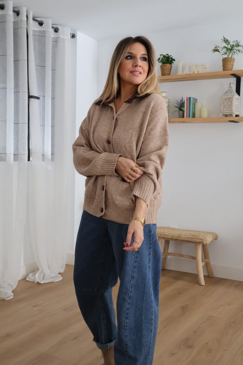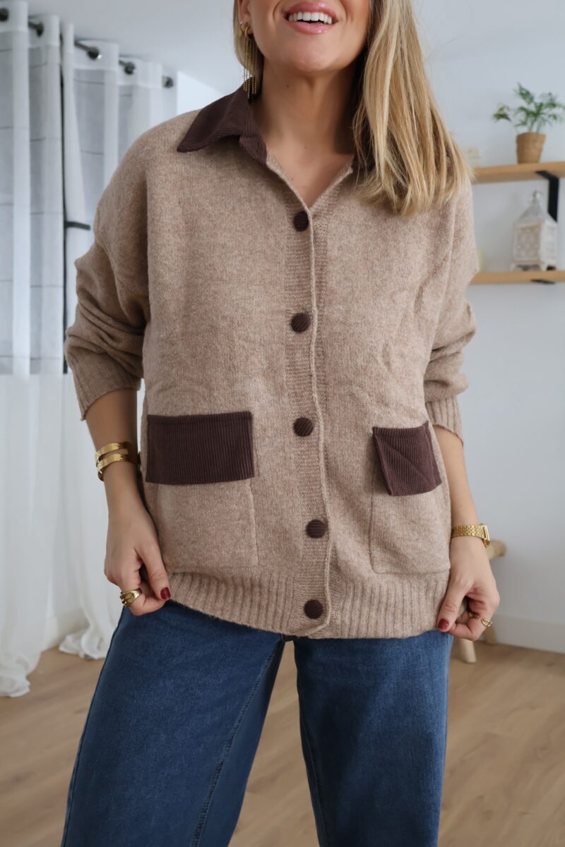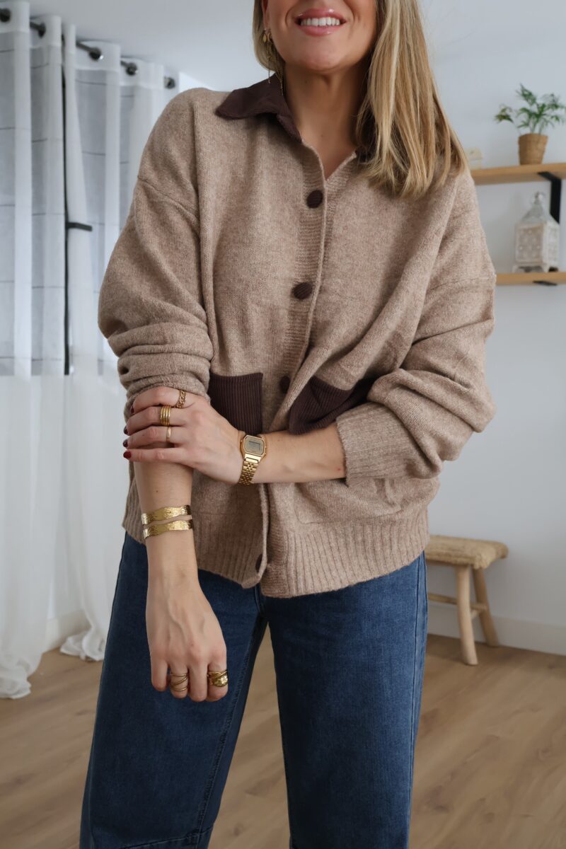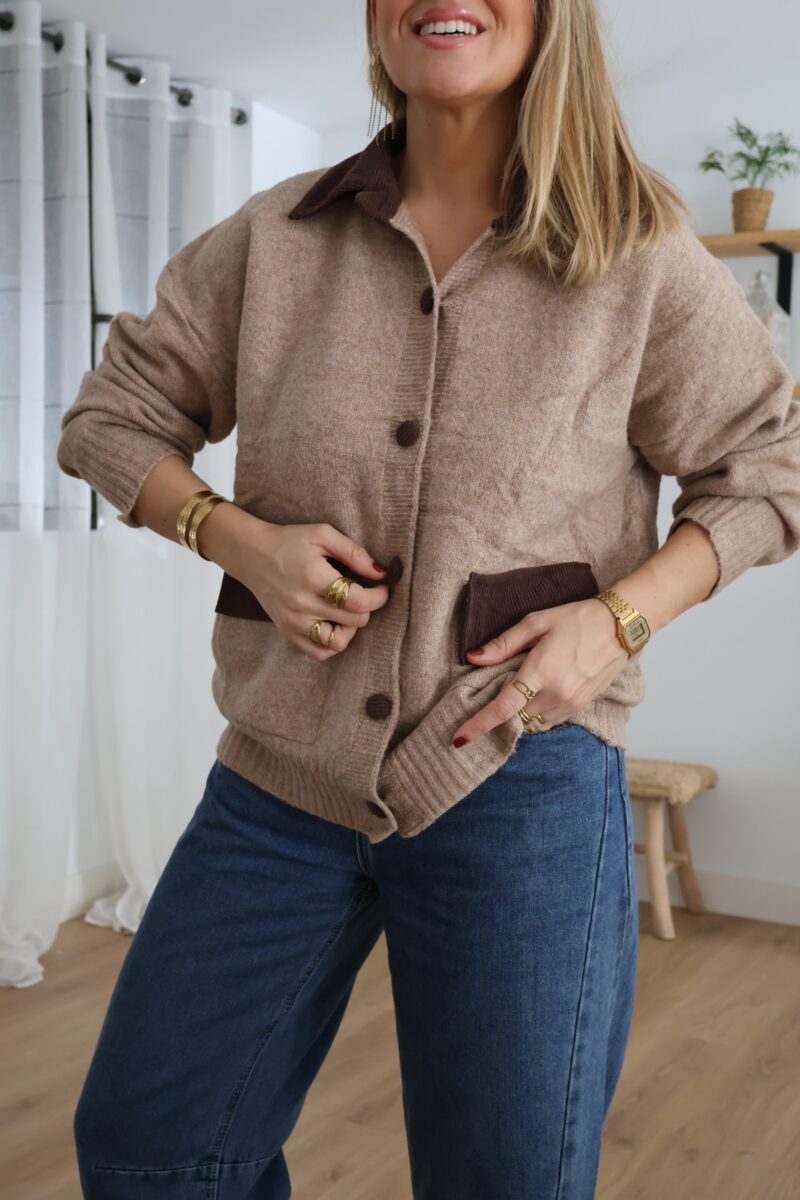 Cárdigan de punto en tono beige con detalles en pana marrón. Diseñado con cuello, botones y bolsillos frontales a contraste. Suave, cómodo y perfecto para un look casual con un toque elegante.