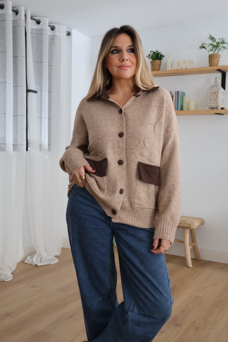 Cárdigan de punto en tono beige con detalles en pana marrón. Diseñado con cuello, botones y bolsillos frontales a contraste. Suave, cómodo y perfecto para un look casual con un toque elegante.