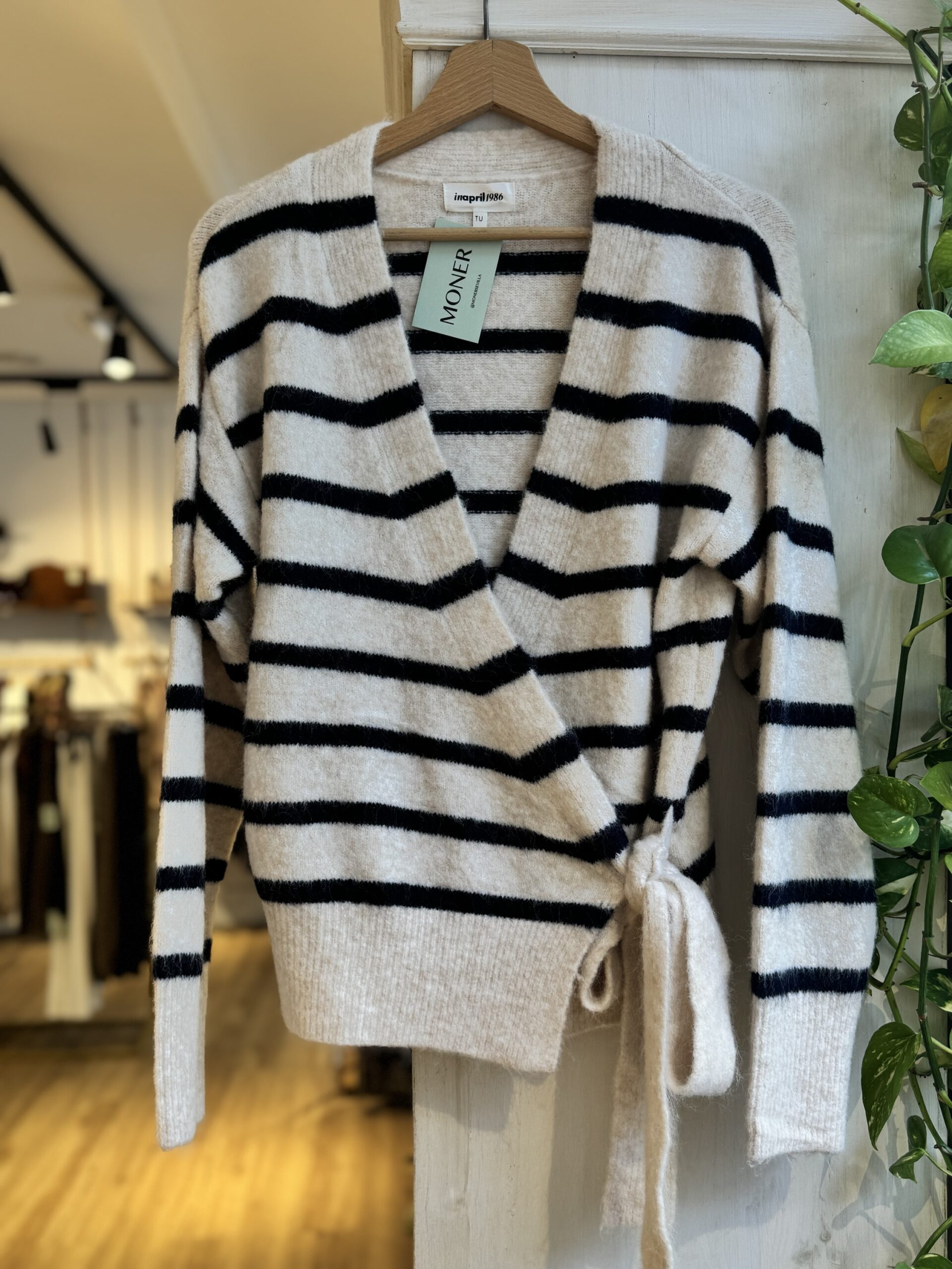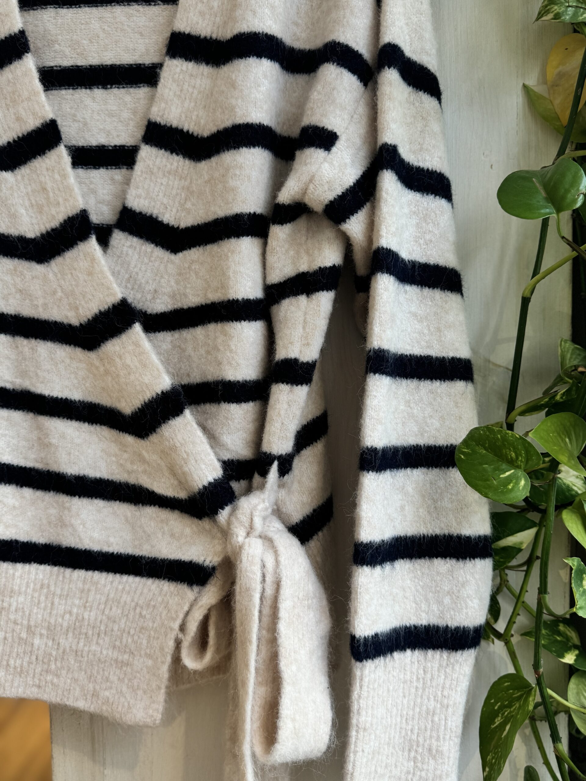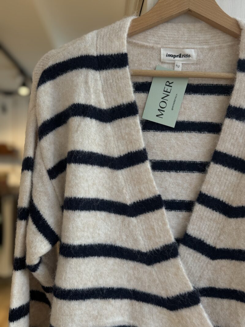 Cárdigan de rayas azul, marino y beig , cruzado a la izquierda con lazada y botón interior.