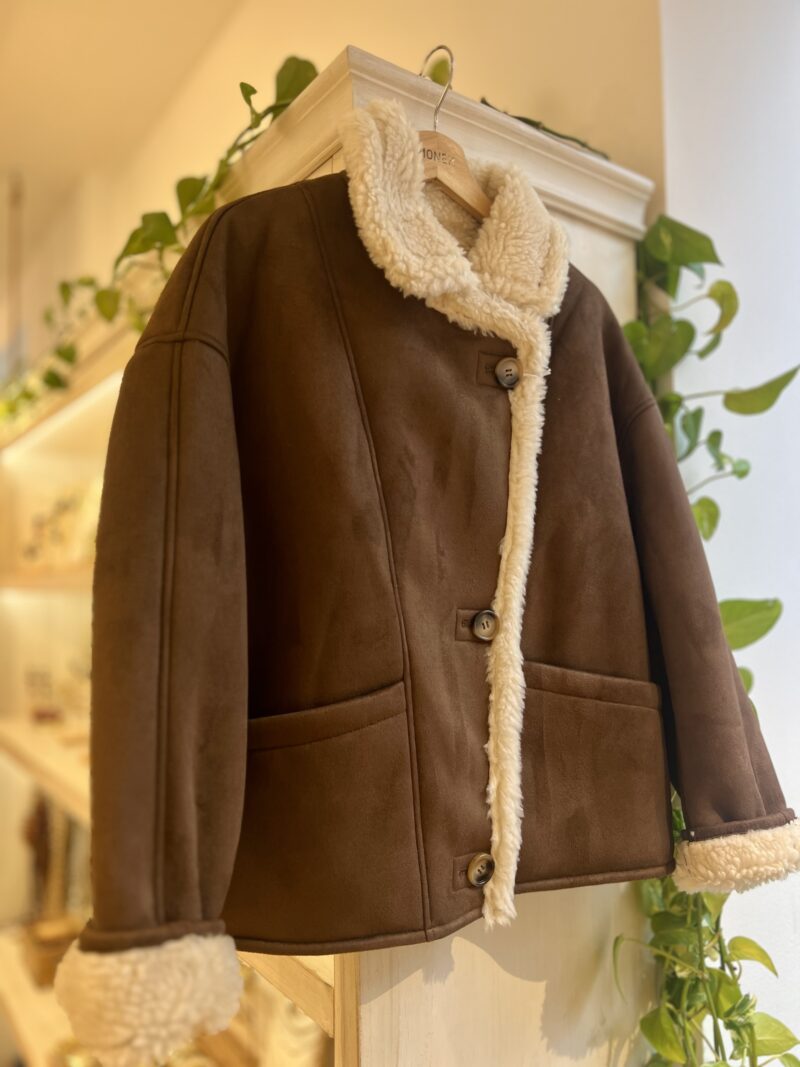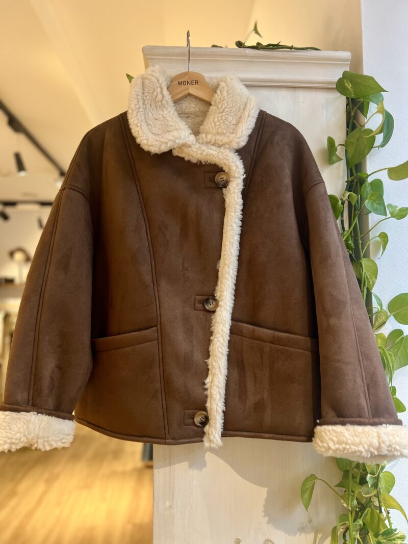 Esta chaqueta combina calidez y estilo en una prenda perfecta para el invierno. Está confeccionada en un tejido efecto ante de color marrón chocolate, con interior y detalles de borreguito en tono crudo.