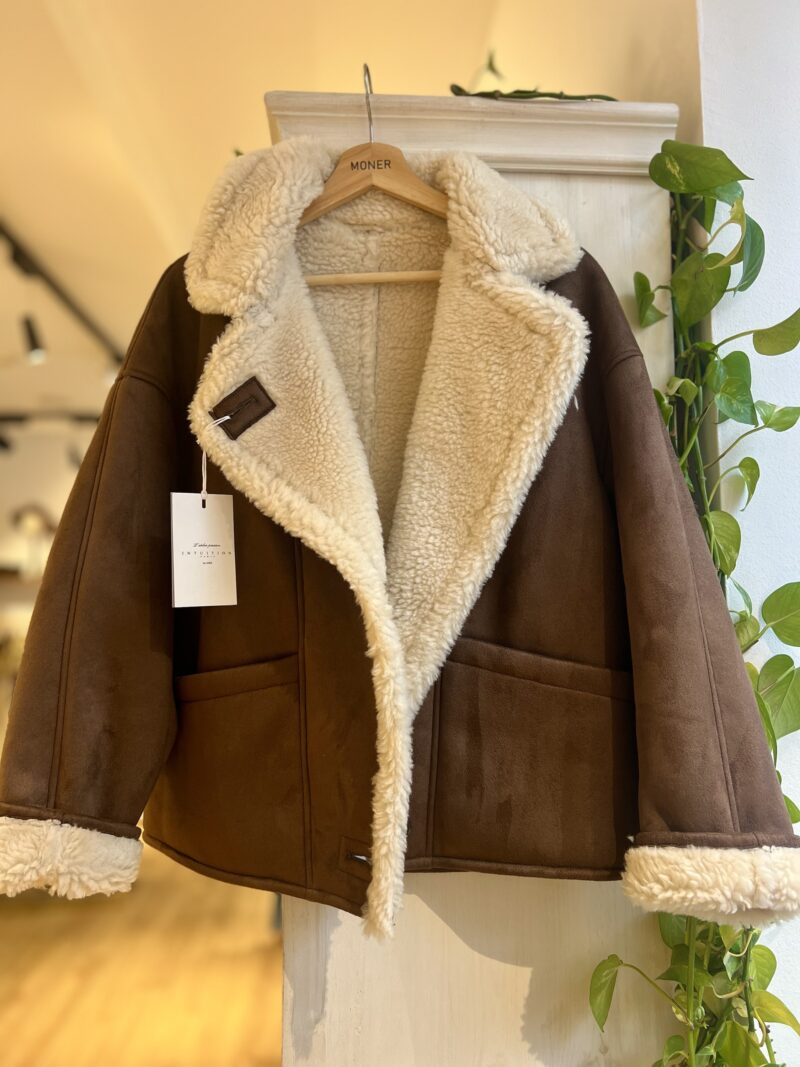 Esta chaqueta combina calidez y estilo en una prenda perfecta para el invierno. Está confeccionada en un tejido efecto ante de color marrón chocolate, con interior y detalles de borreguito en tono crudo.