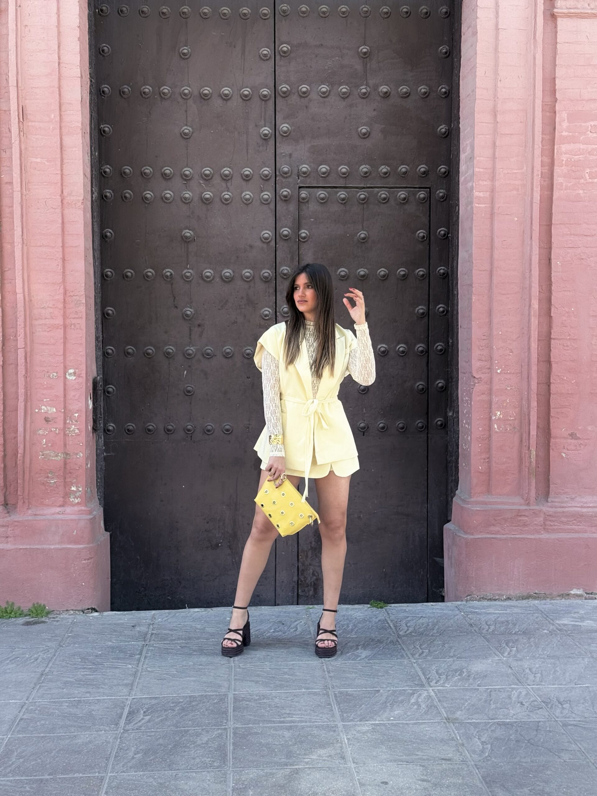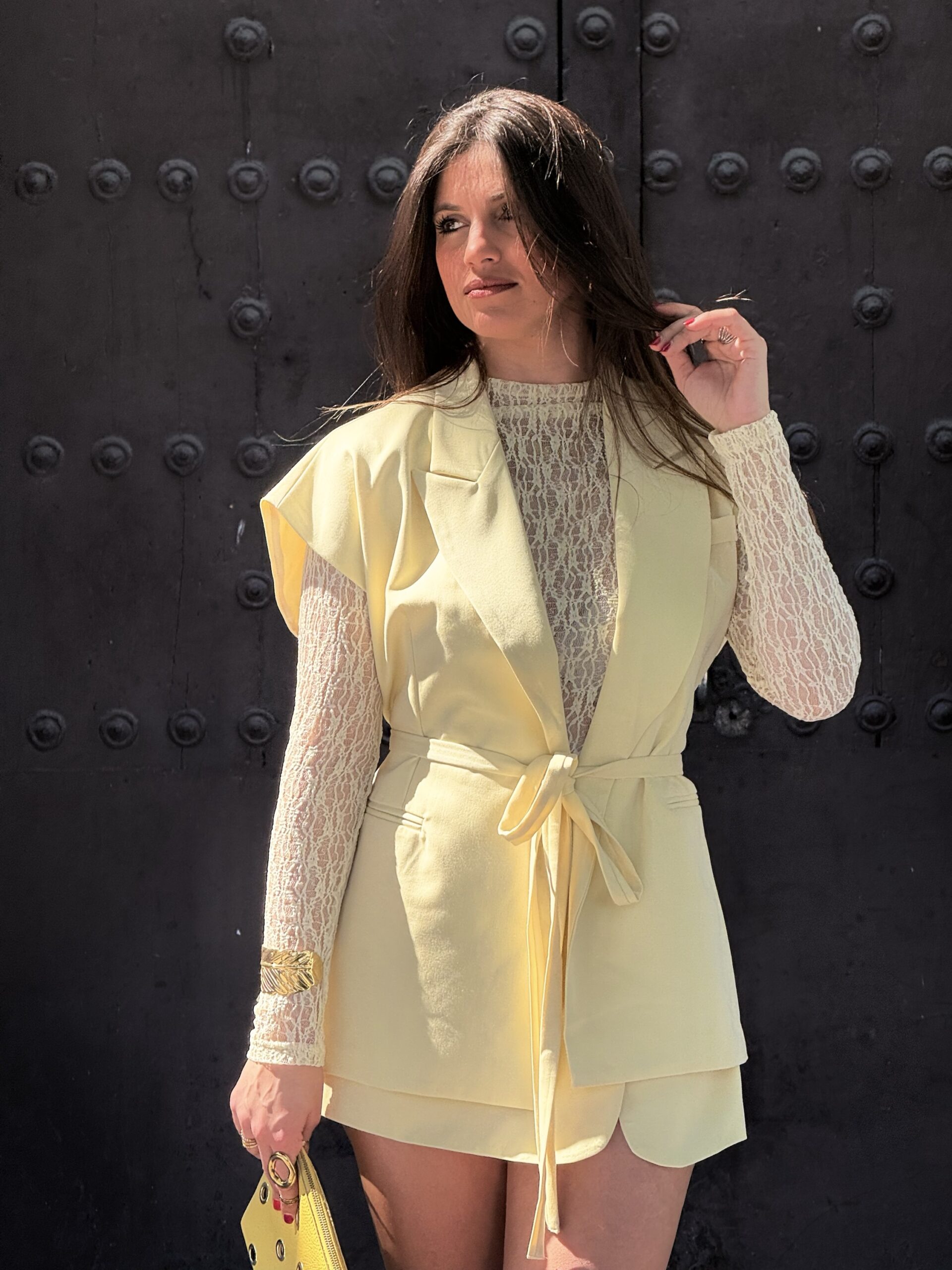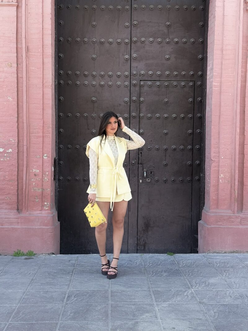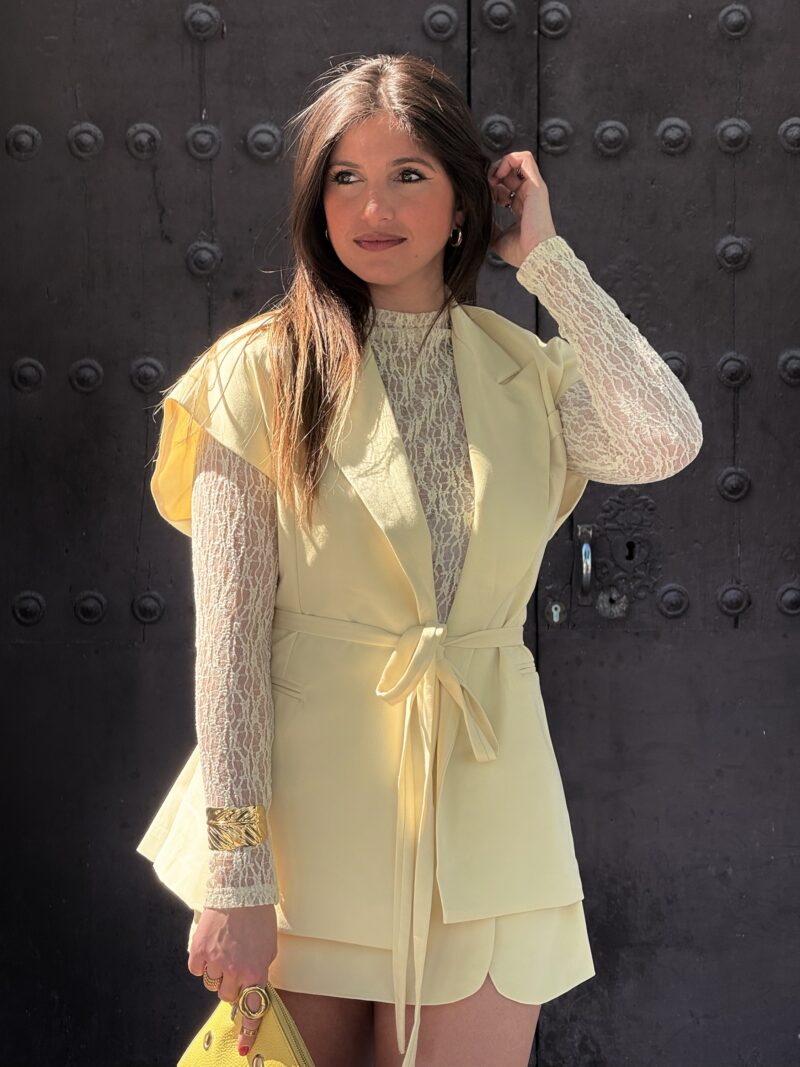 Conjunto de falda pantalón en color amarillo con chalequillo