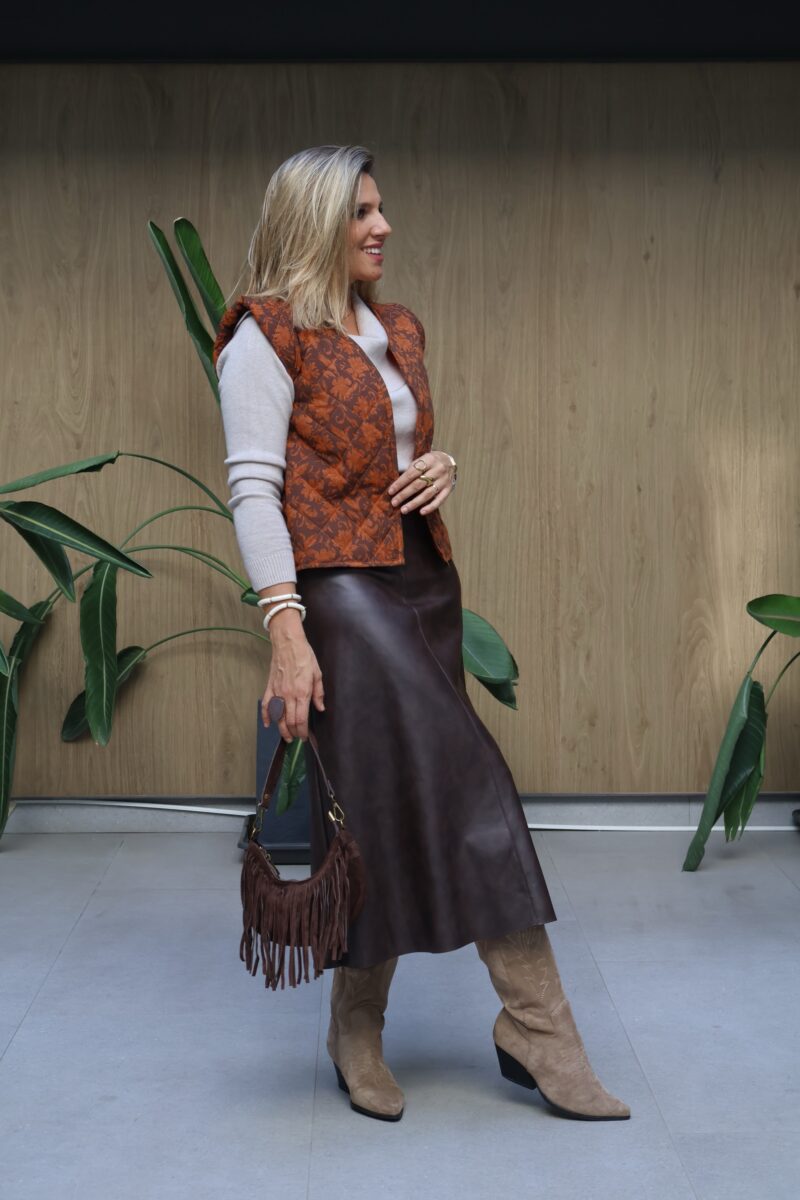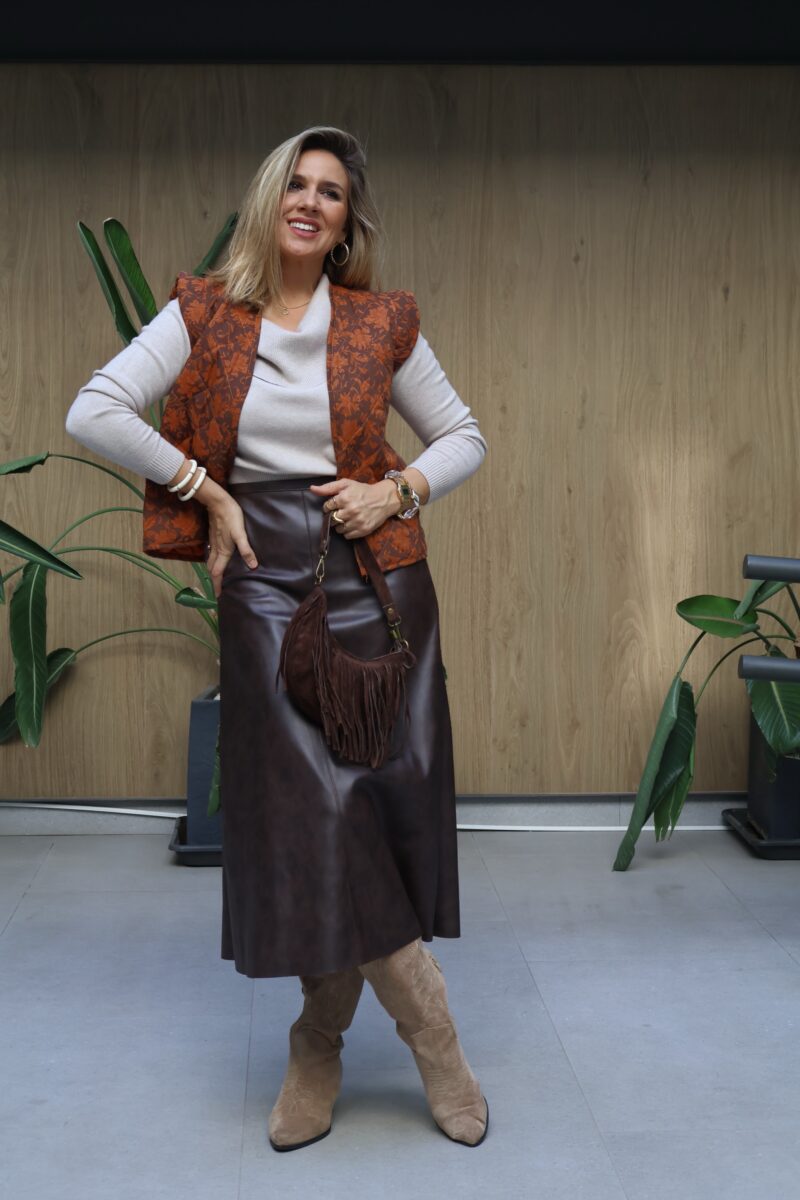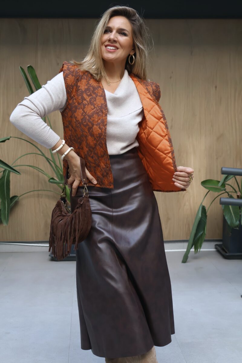 Falda midi polipiel. Cierre de cremallera lateral. Corte evasé.