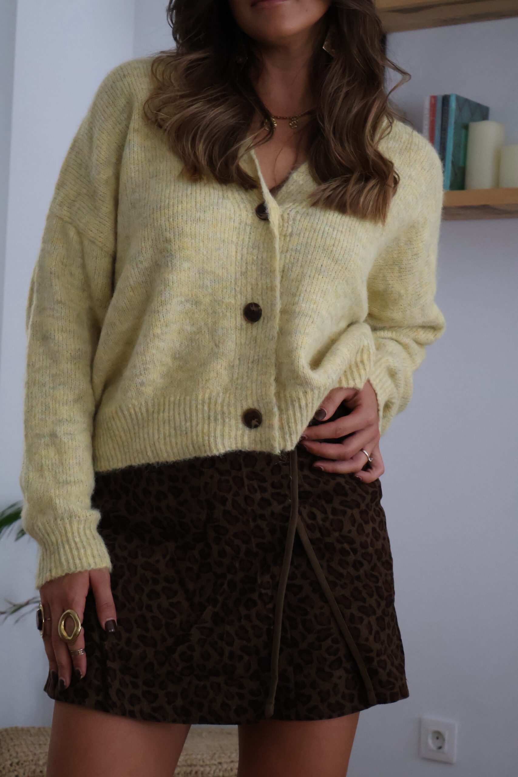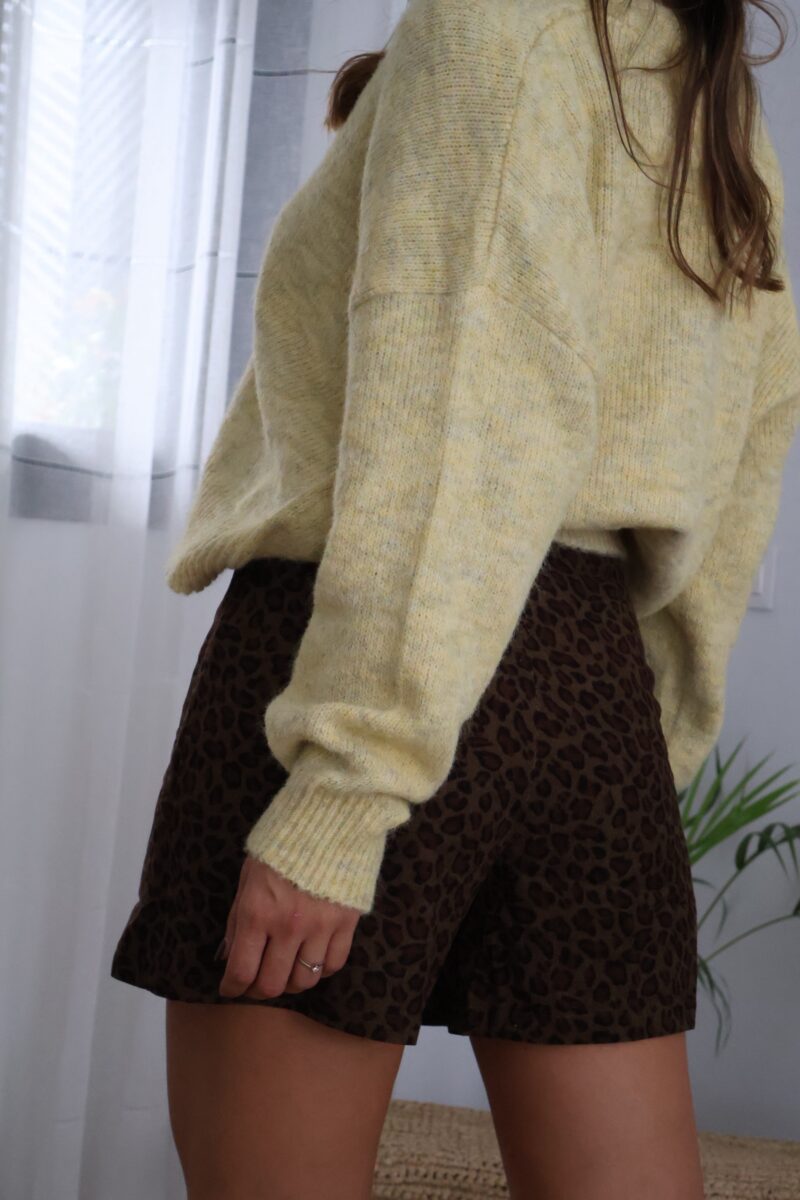 Falda pantalón corta con estampado de animal print. combinación de colores marrón y verde. Cierre de cremallera lateral.