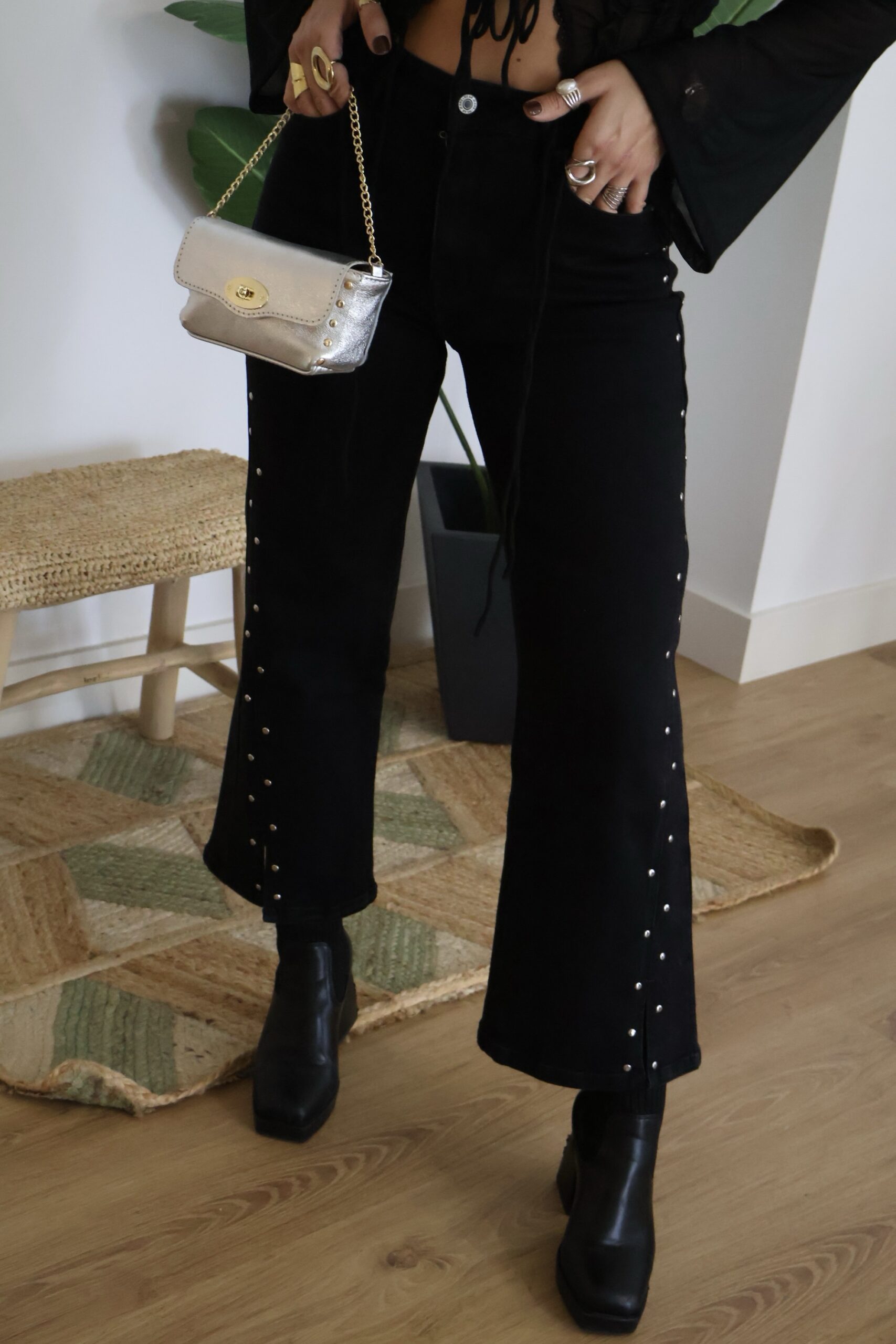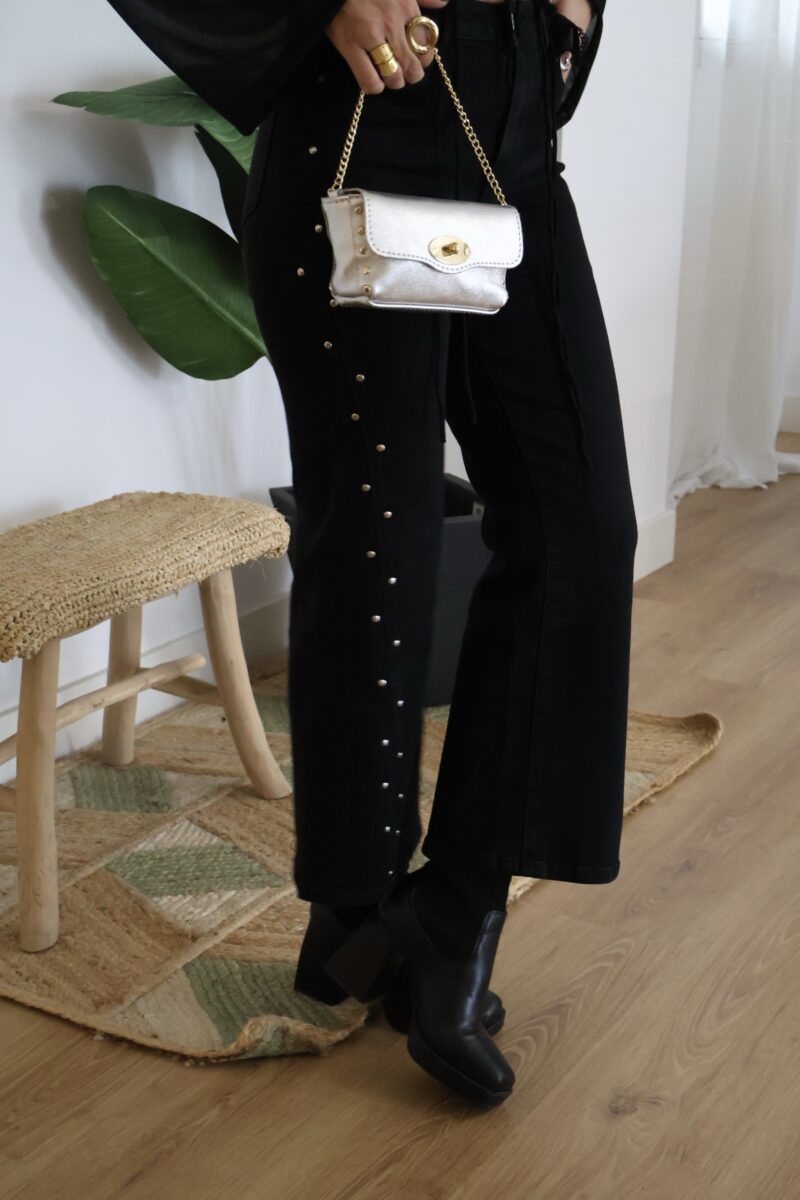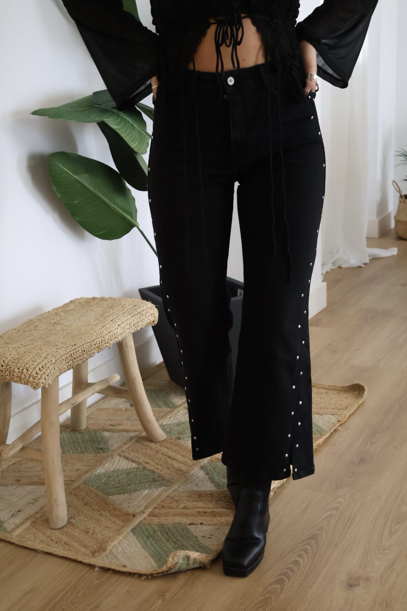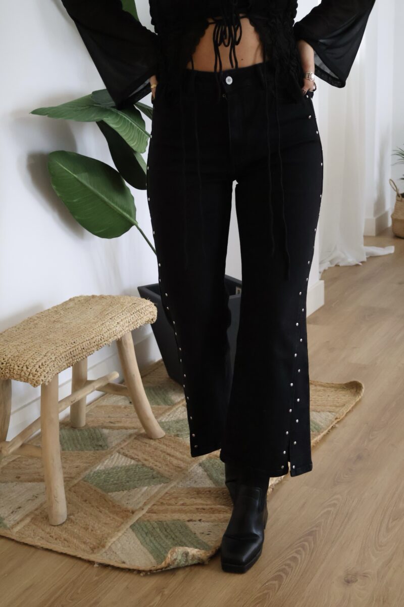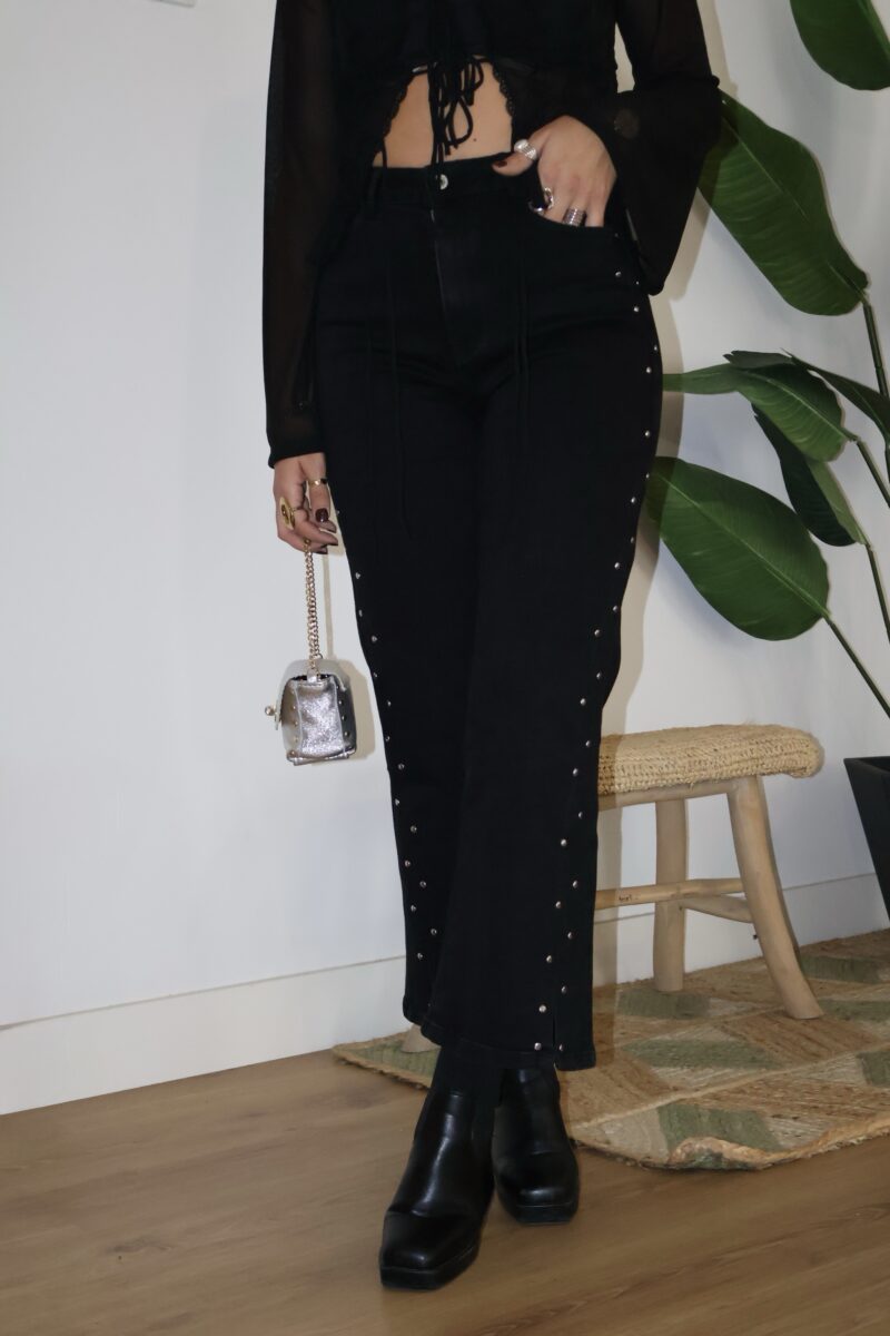 Jeans negro con tachuelas plateadas. Detalle de abertura en los bajos por delante. Corte recto con cierre de botón y cremallera.