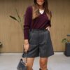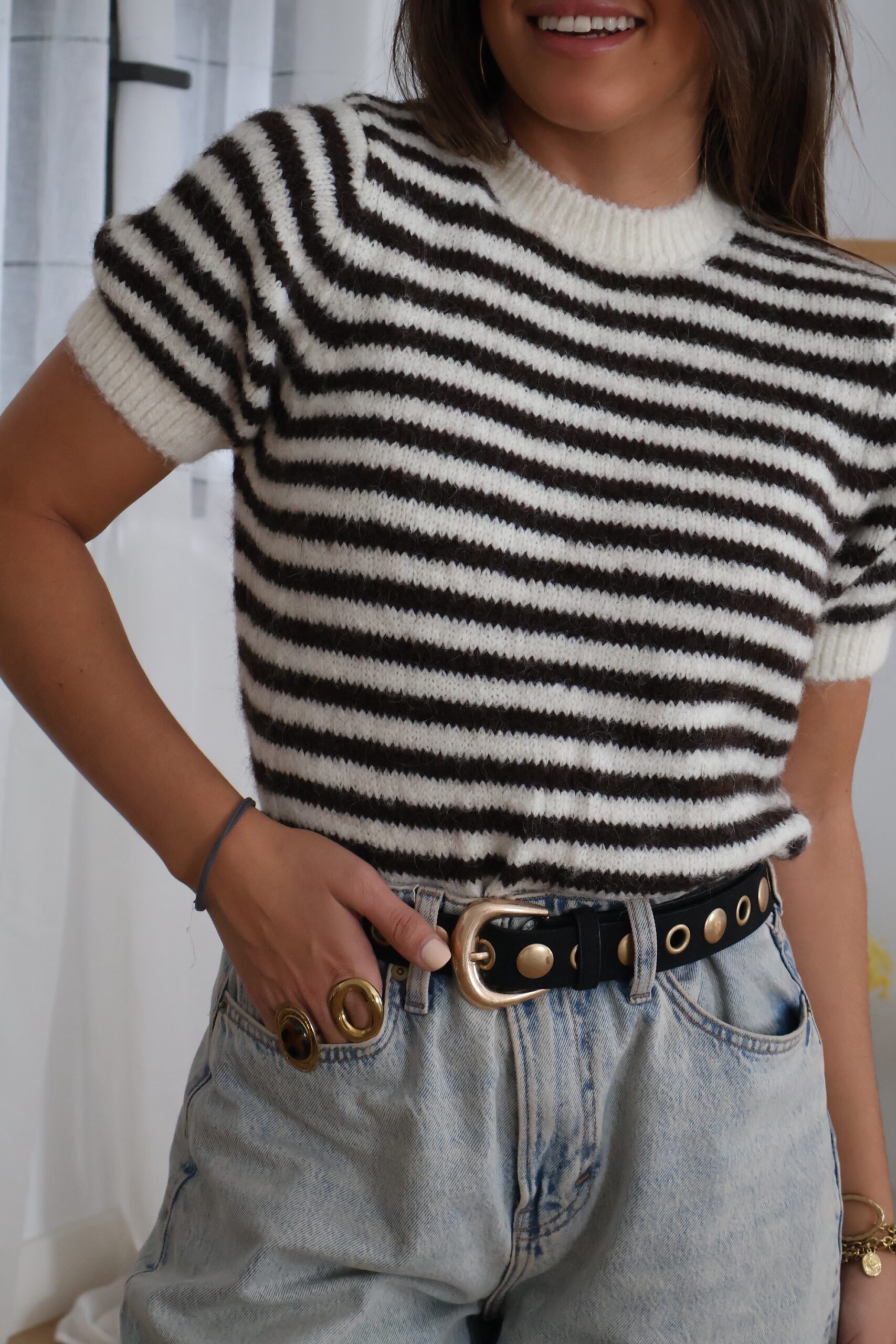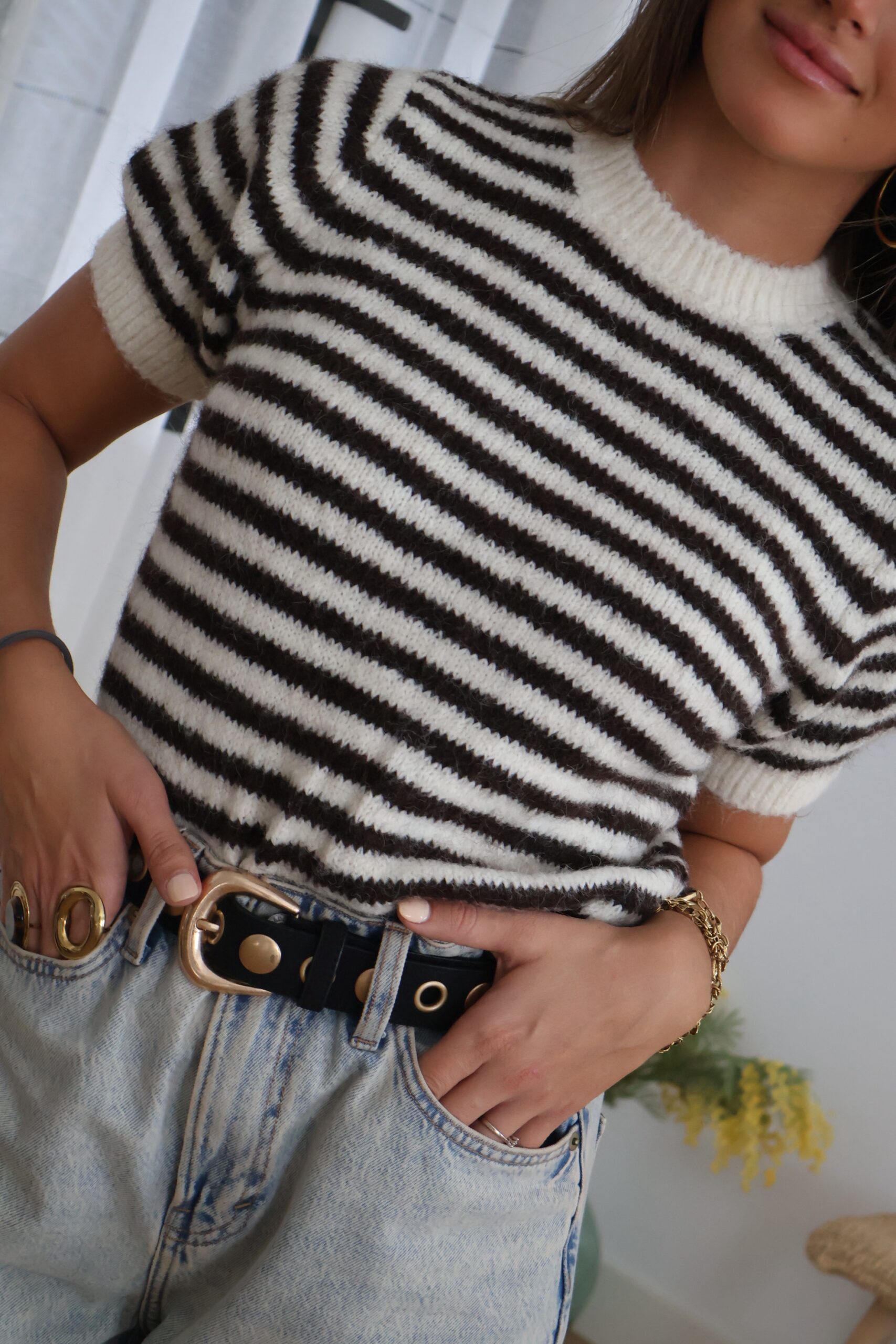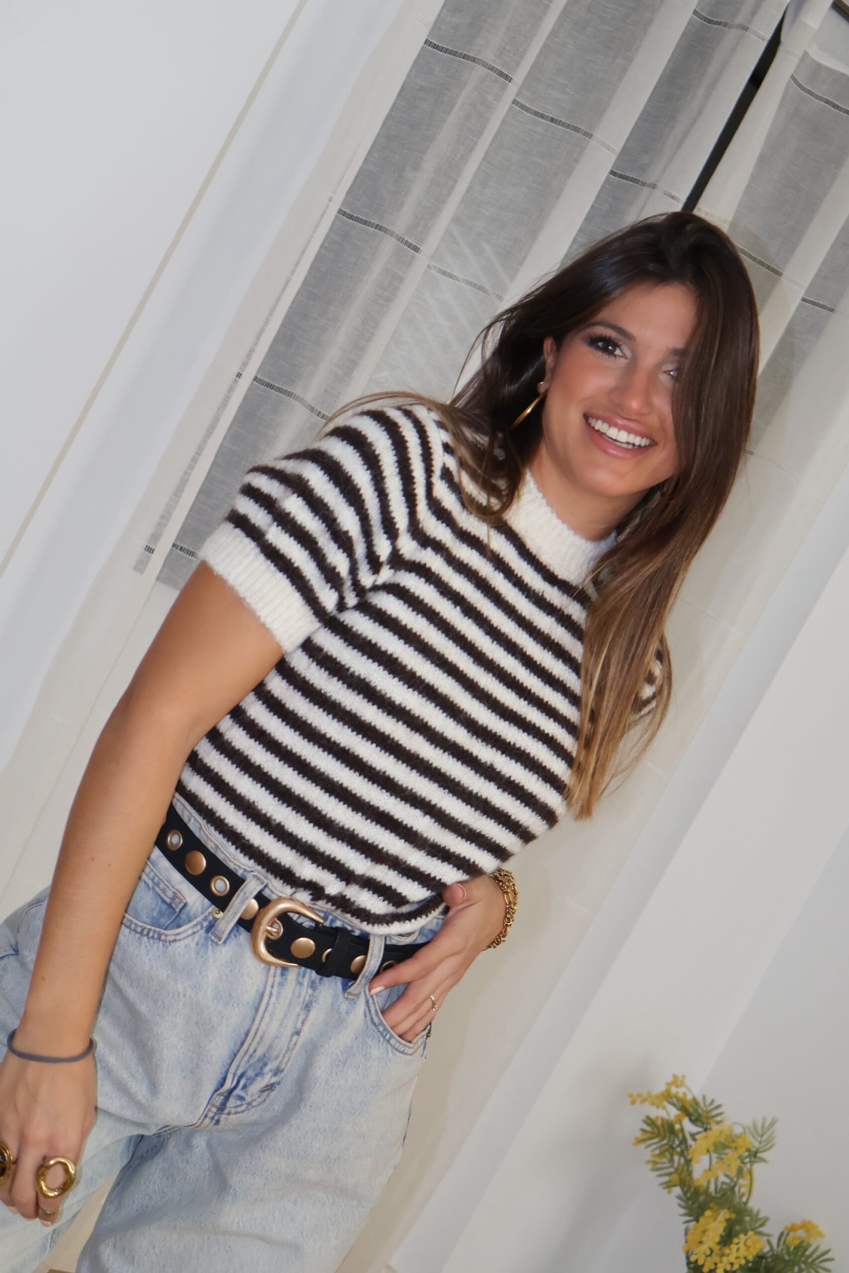 Jersey manga corta de lana con rayas. Cuello redondo.