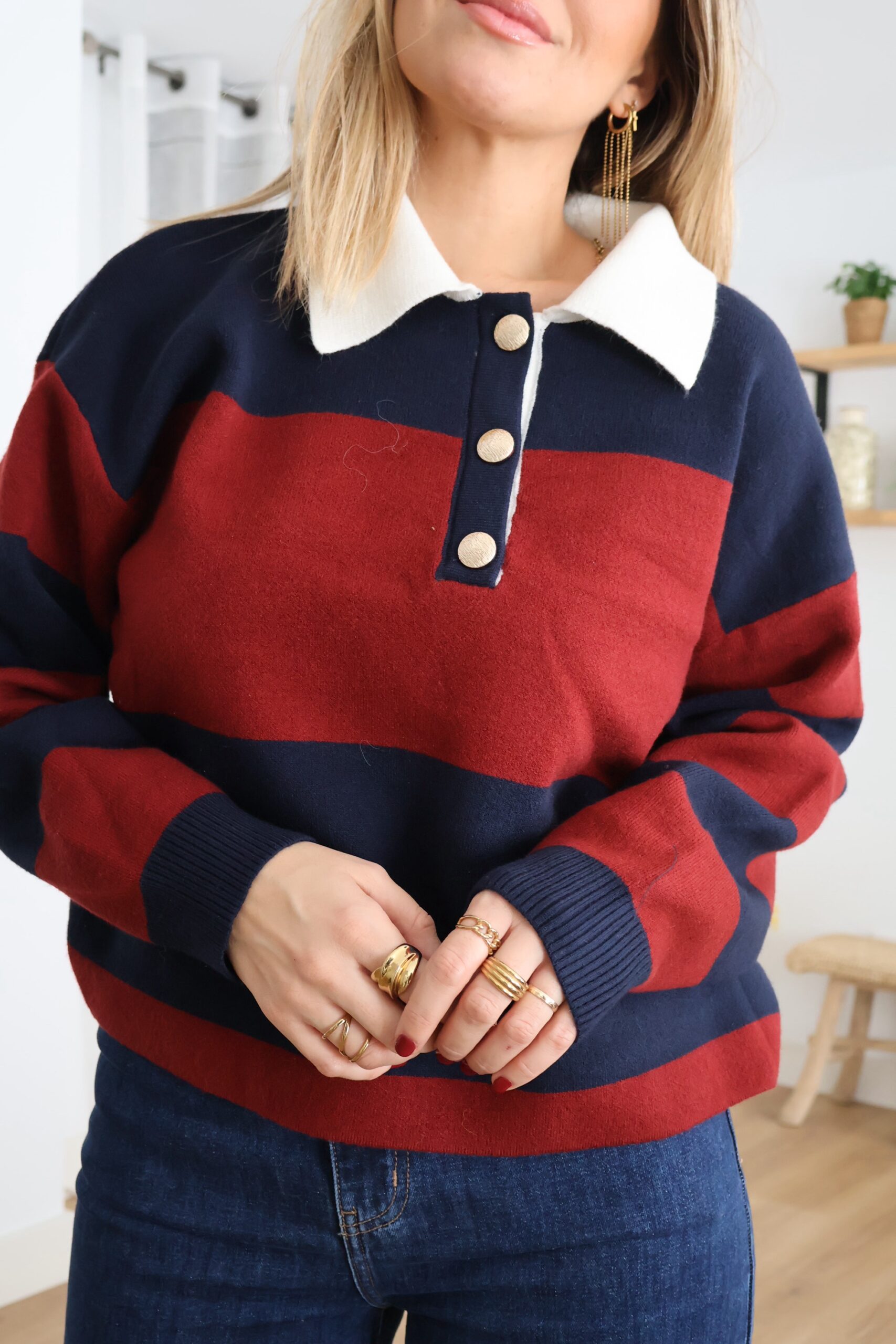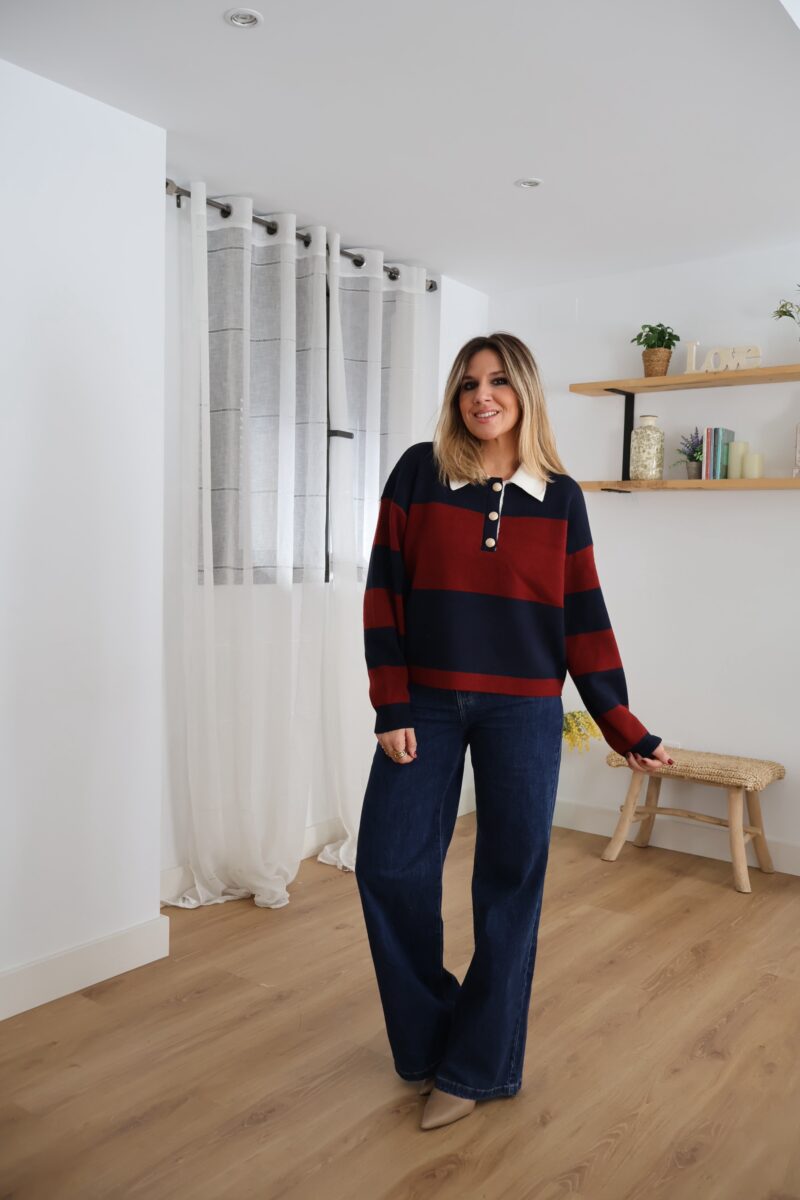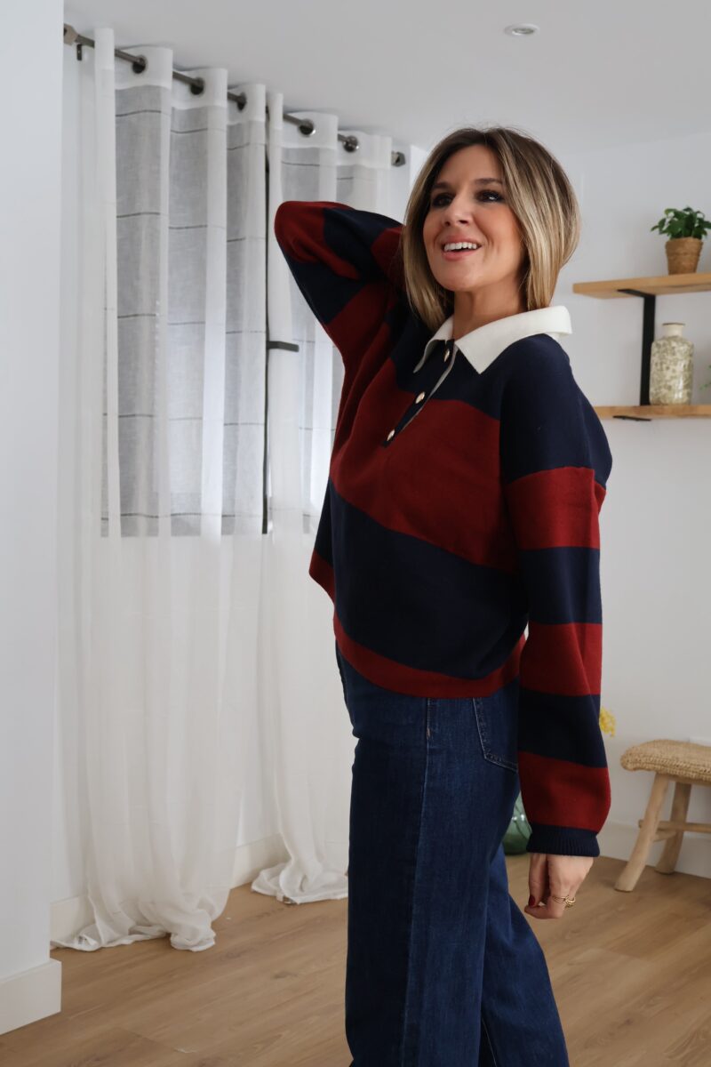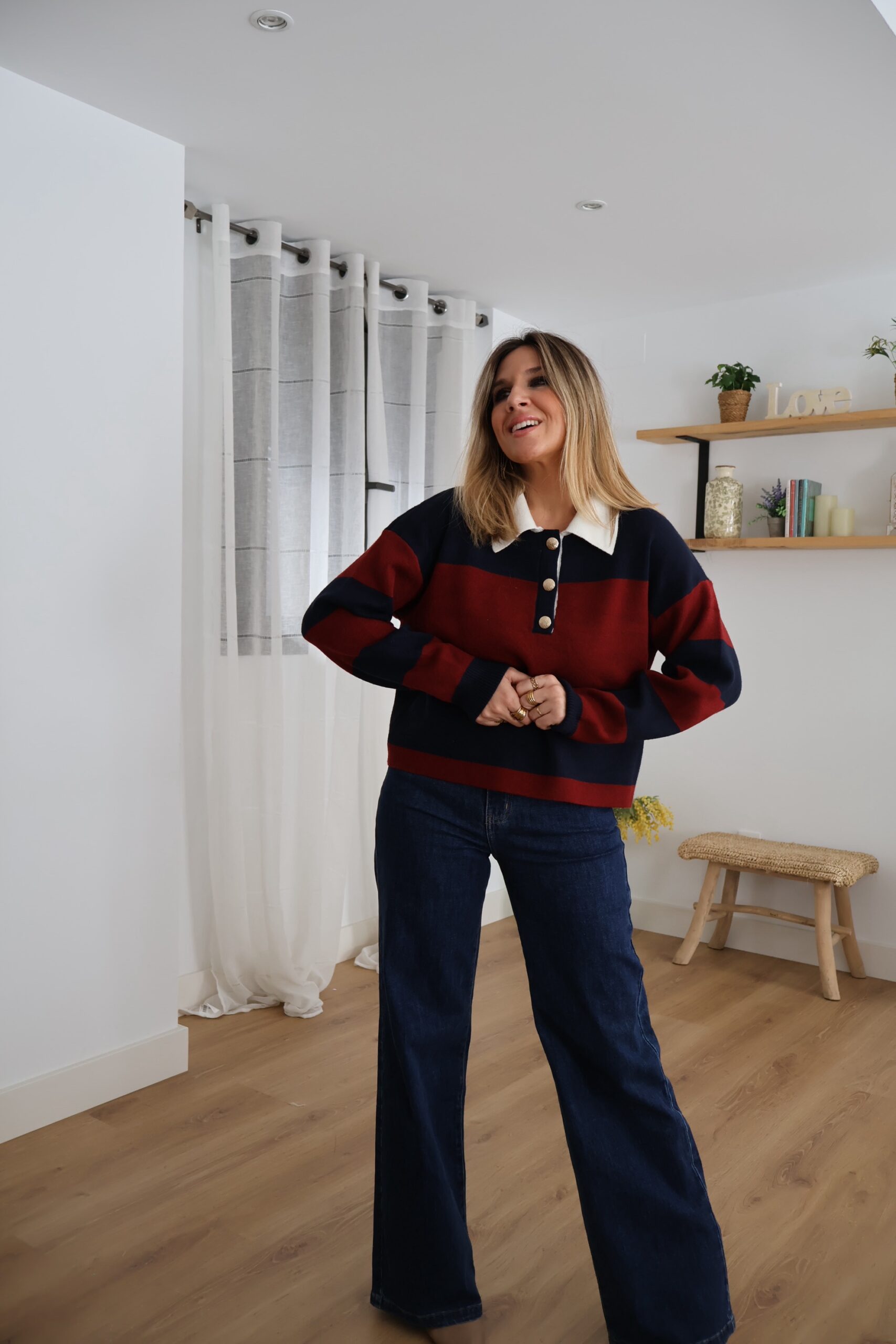 Jersey de rayas azul y rojo con cuellos blanco efecto polo con tres botones dorados. Manga larga.