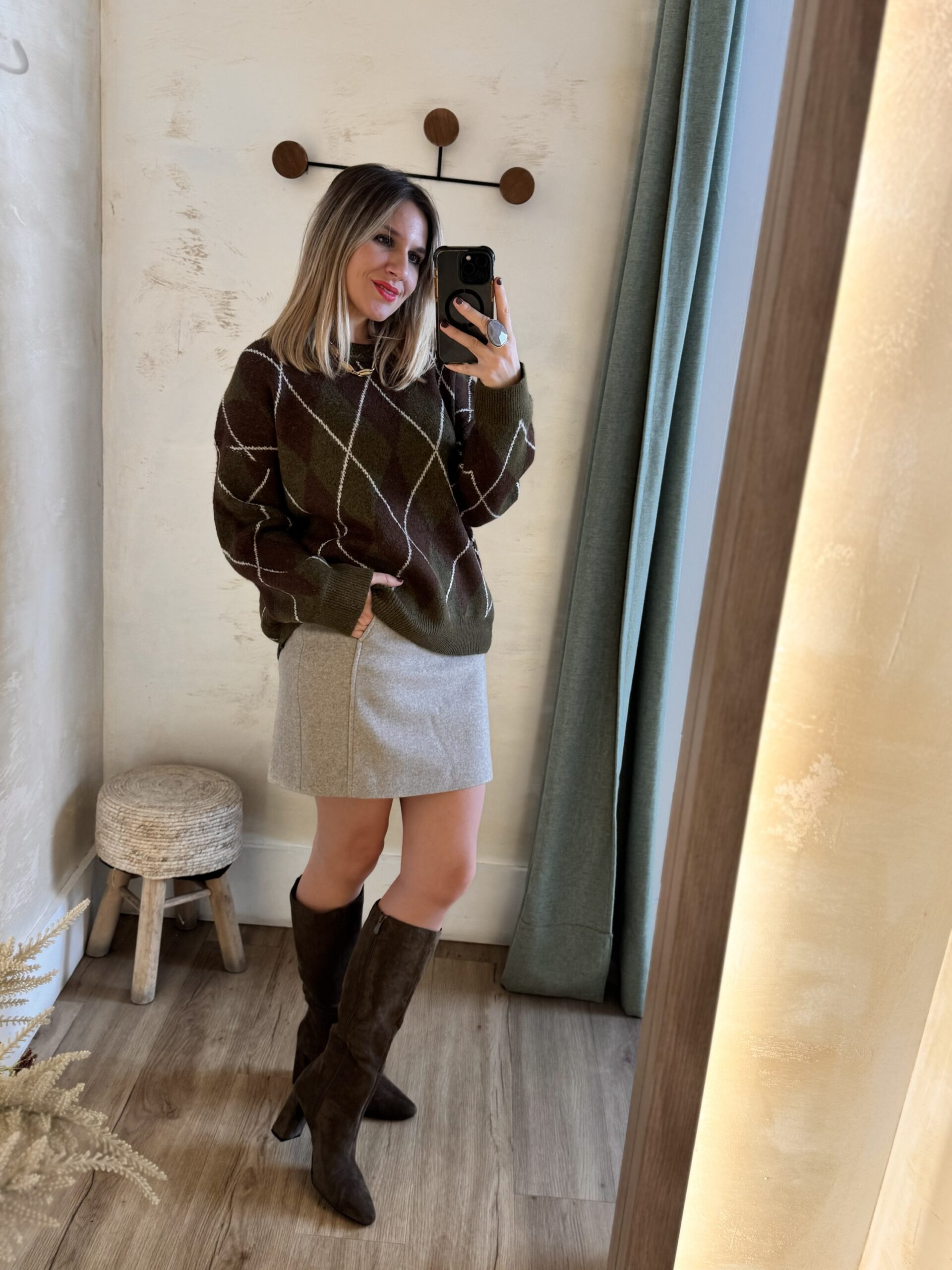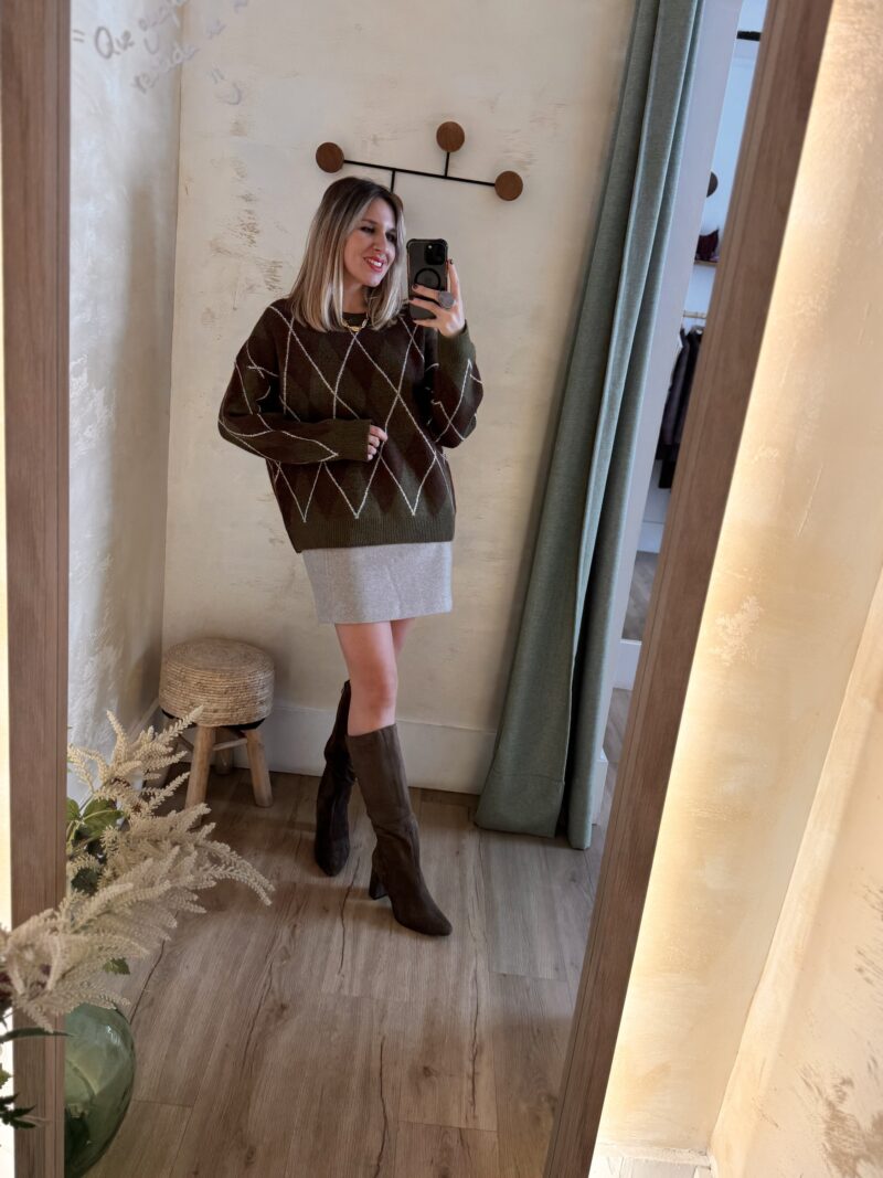 Jersey de rombos en color verde y marrón. Cuello redondo y estilo oversize.