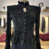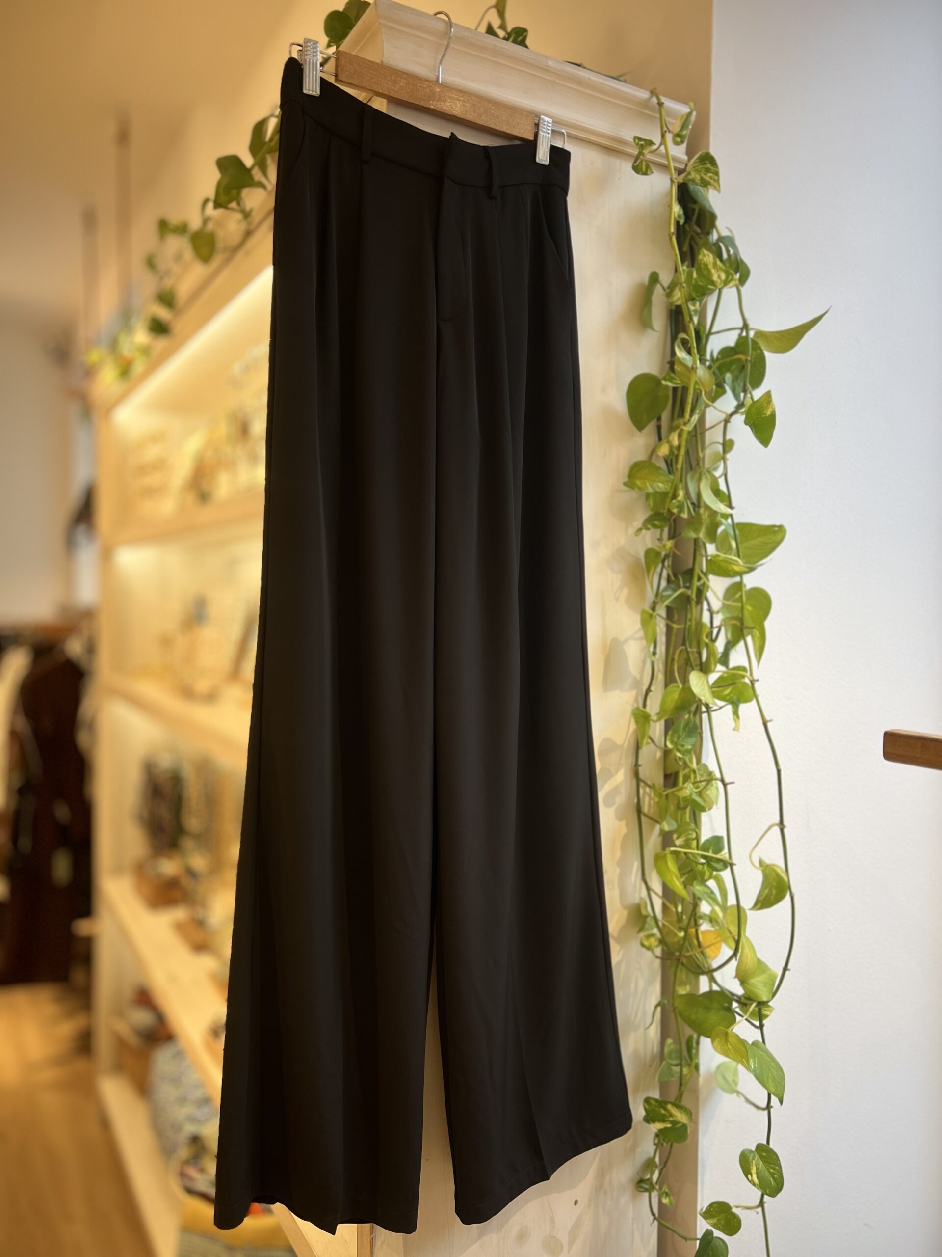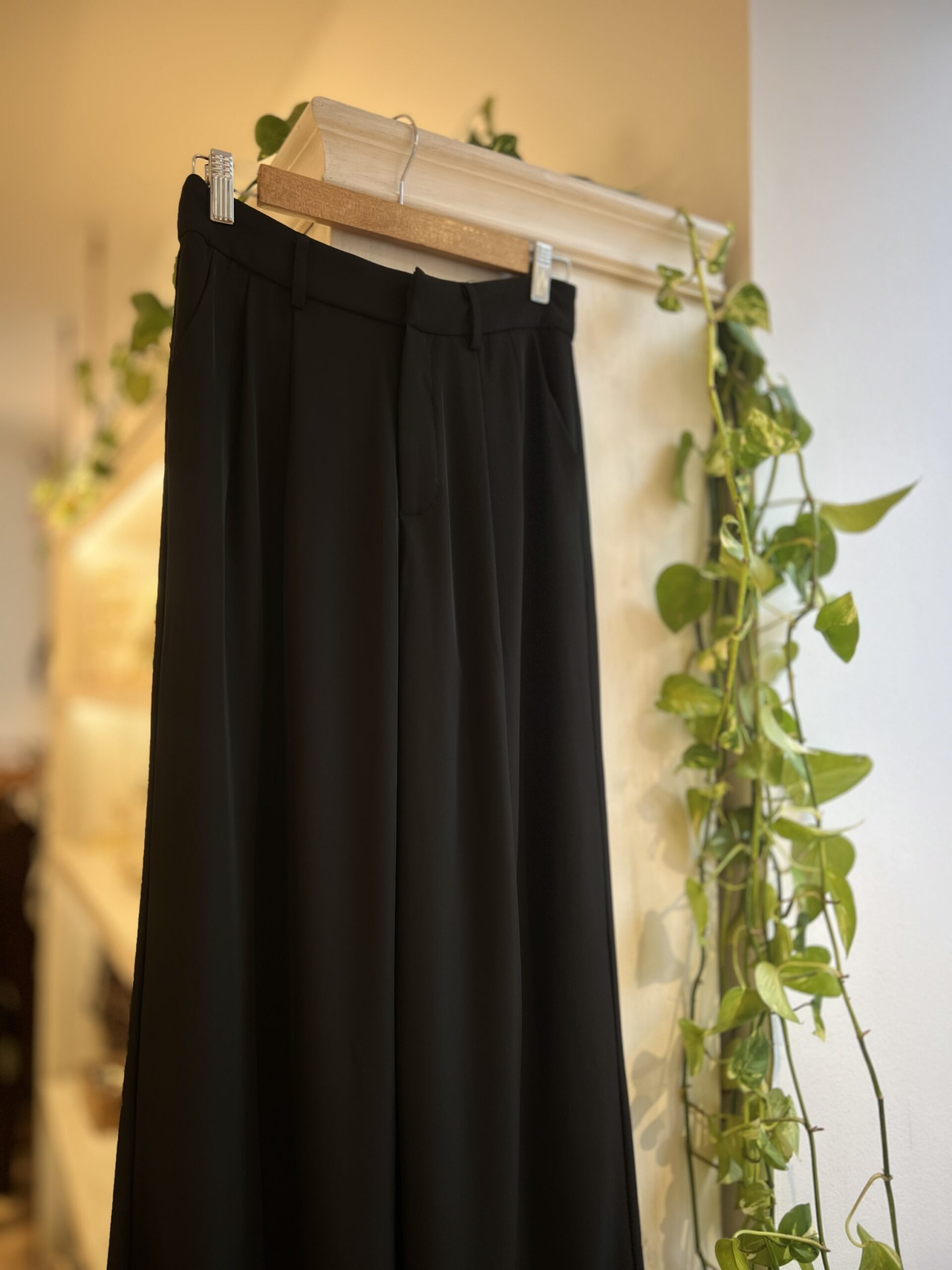 Palazzo largo en color negro de pinzas. Cierre de botón y enganche con cremallera. Trabilla para cinturón. Bolsillos laterales. Tejido fluido.