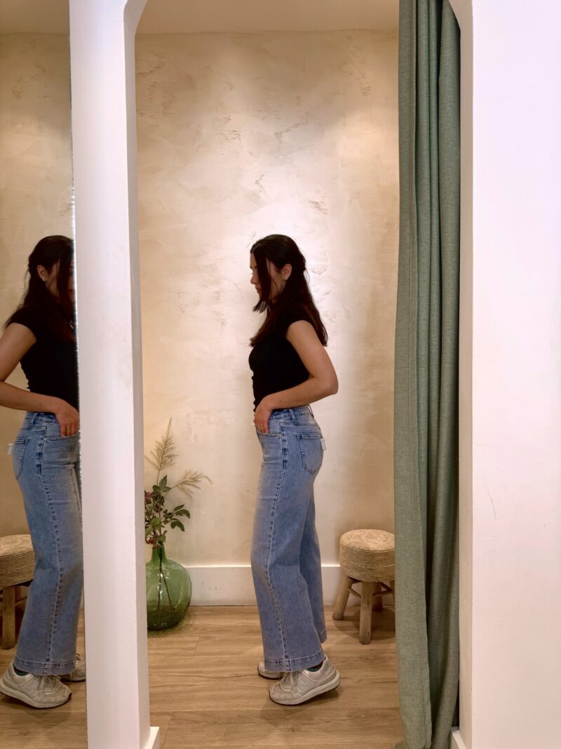 Pantalón vaquero de tiro alto y corte wide leg que estiliza la figura y aporta comodidad. Confeccionado en denim azul lavado con costura frontal que alarga visualmente la pierna.