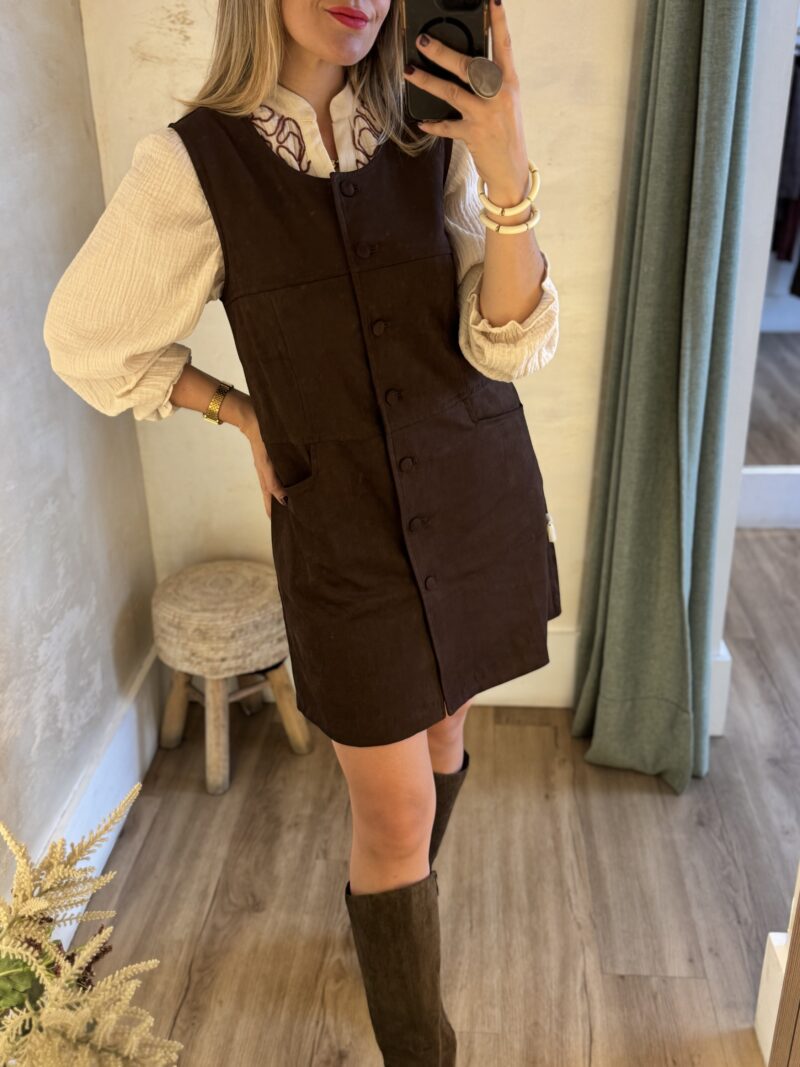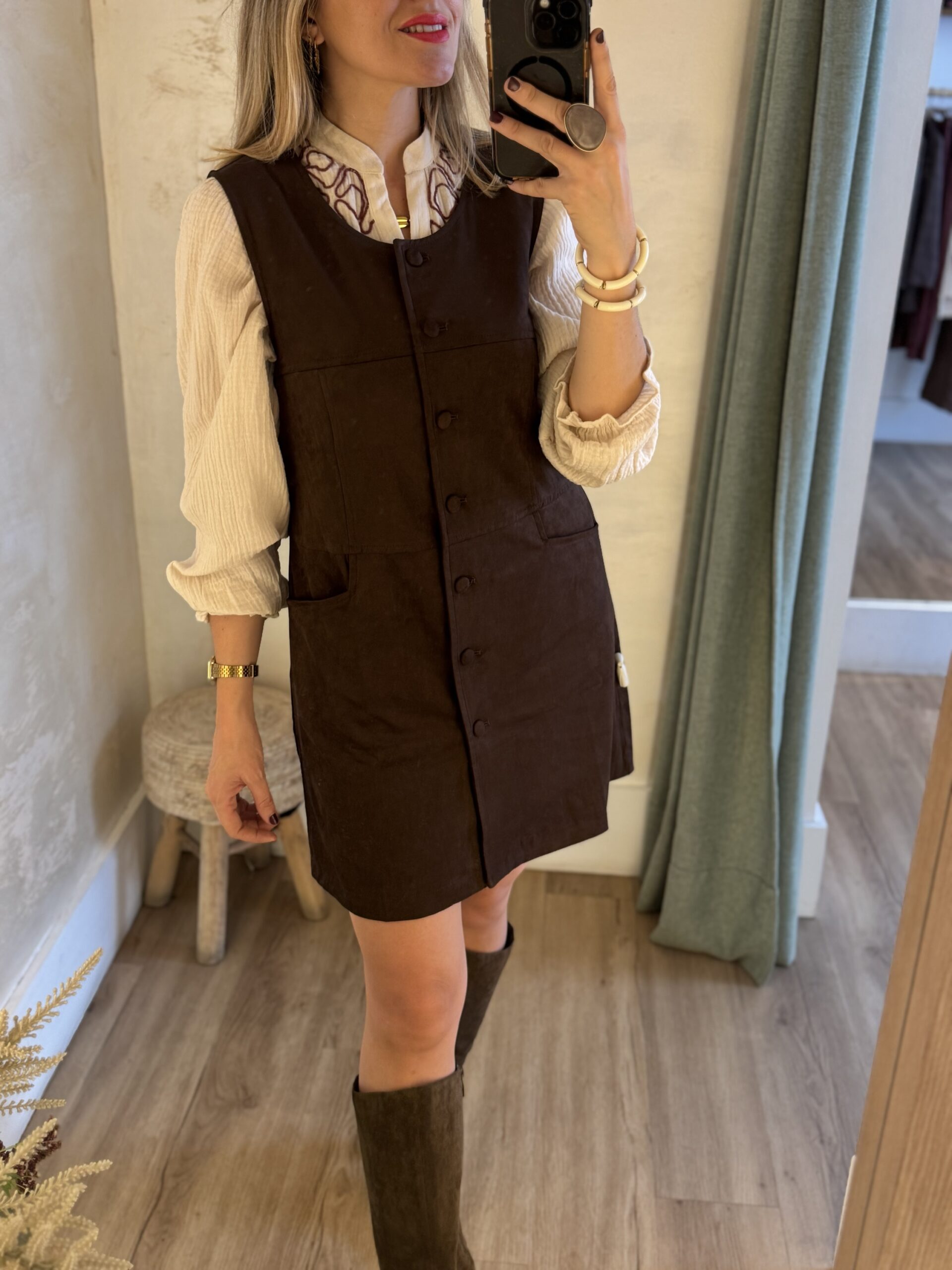 Vestido corto con tejido de antelina. Cierre abotonado y dos bolsillos laterales. Manga a la sisa.