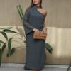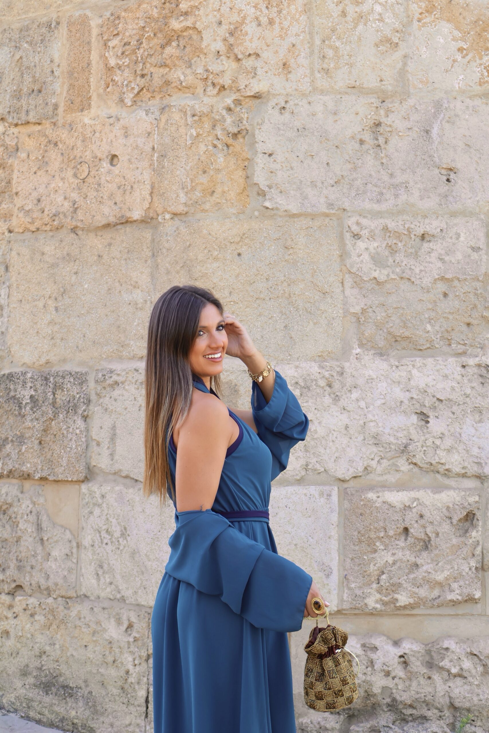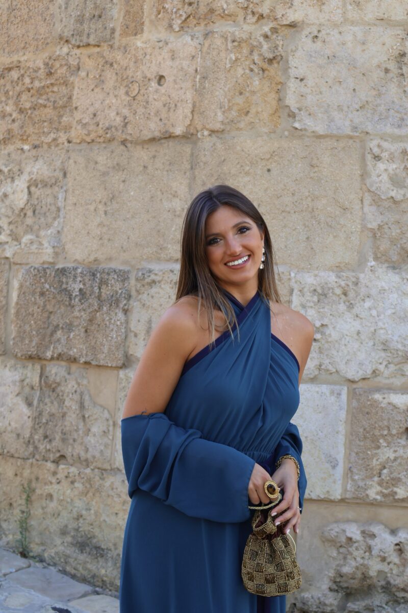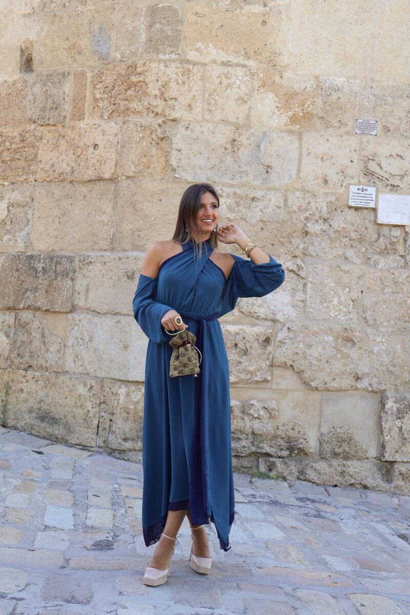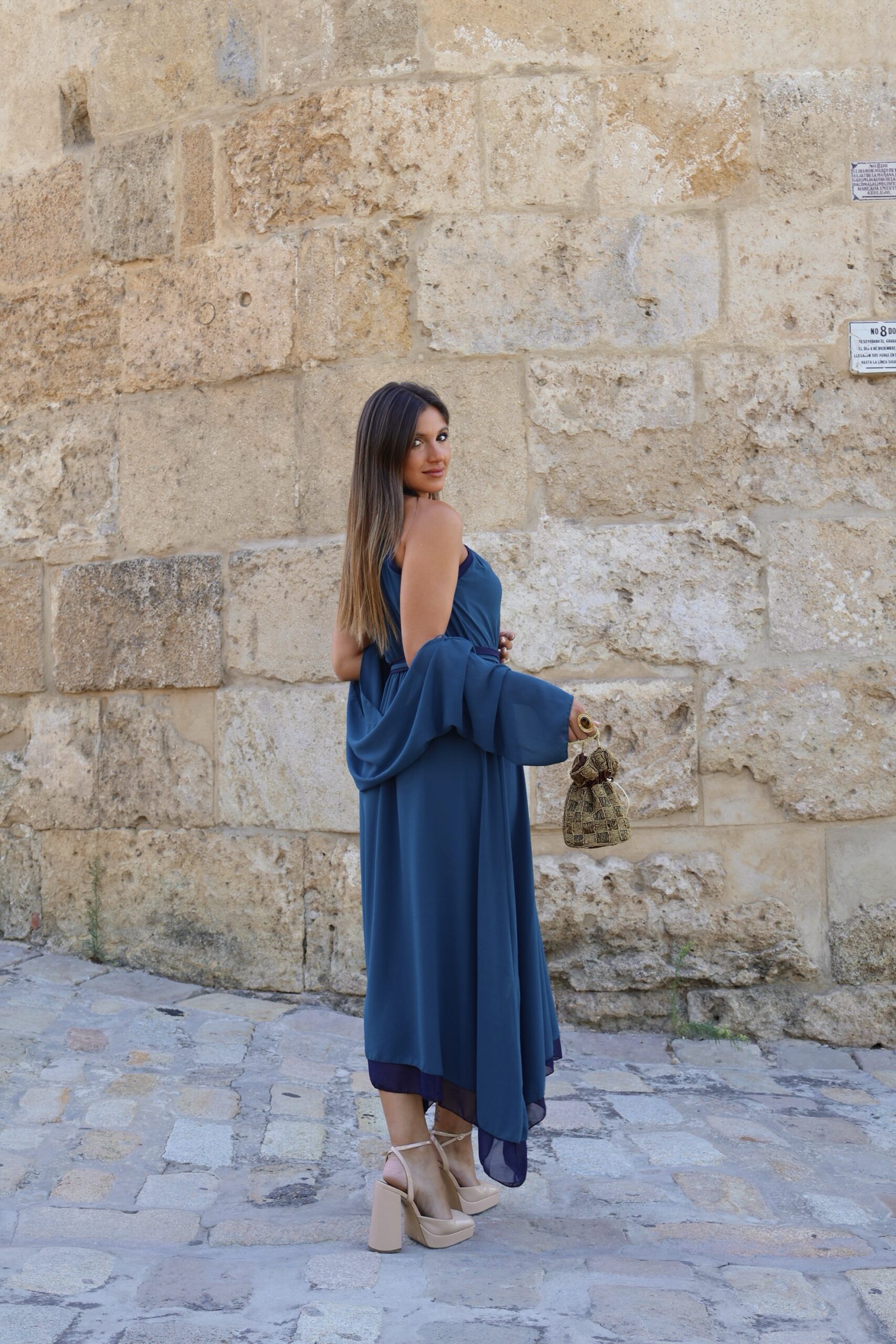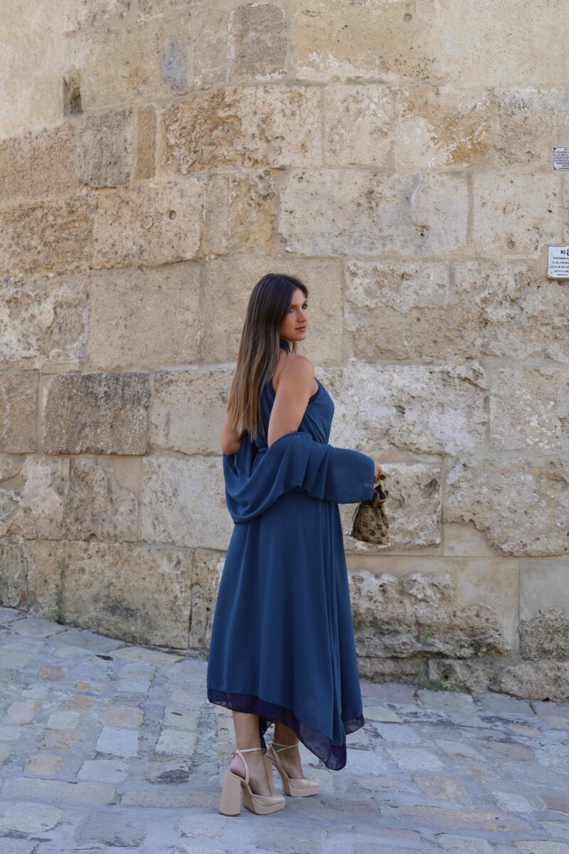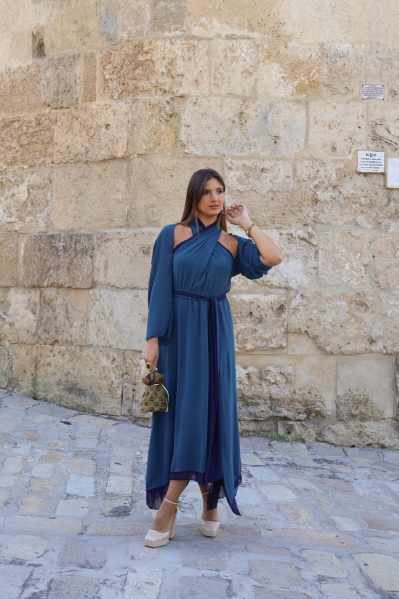 Vestido escote cruzado bicolor. Capa de manga opcional. Abertura lateral y cintura elástica con lazada ajustable.