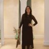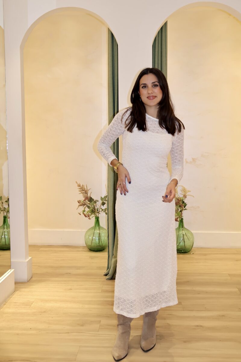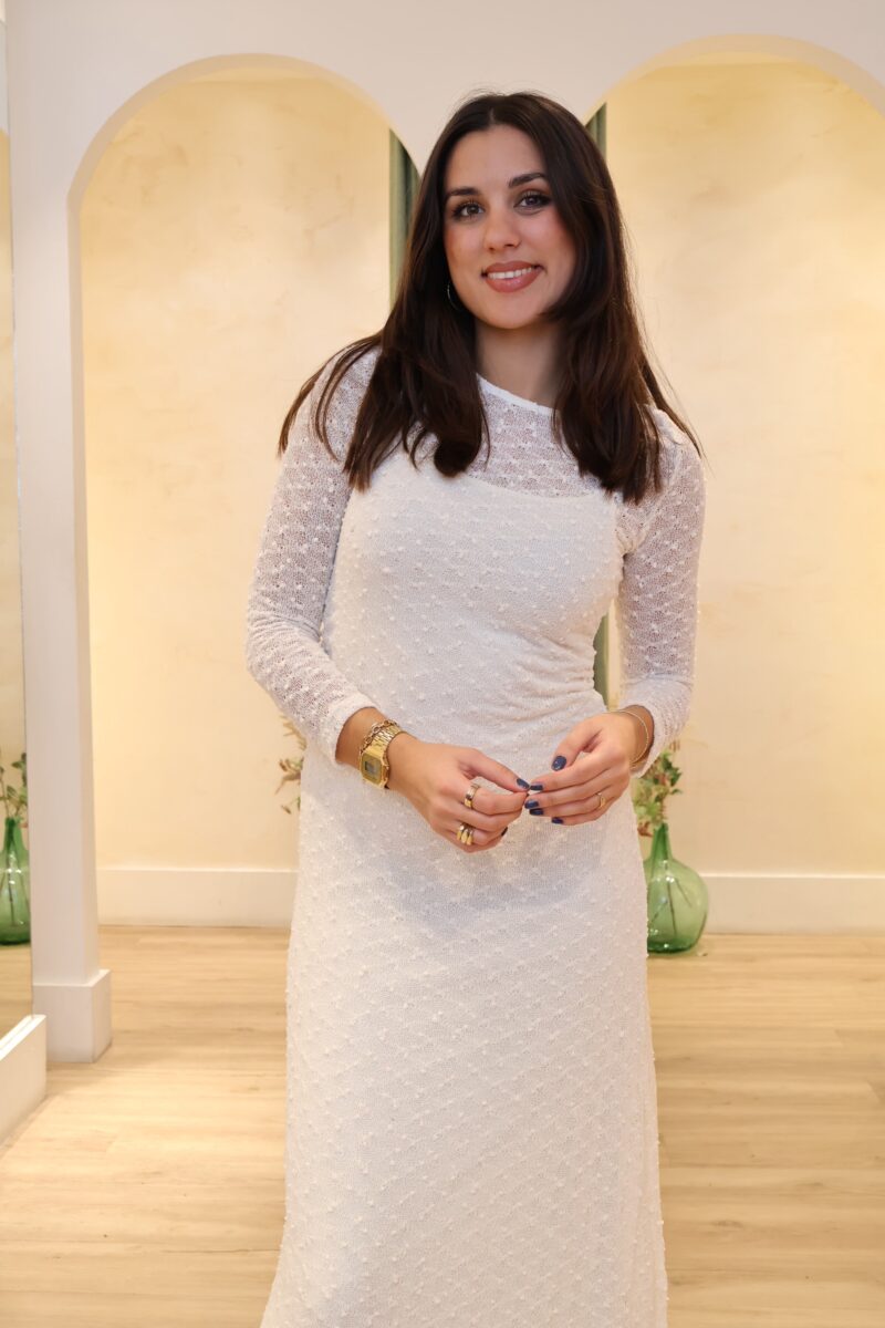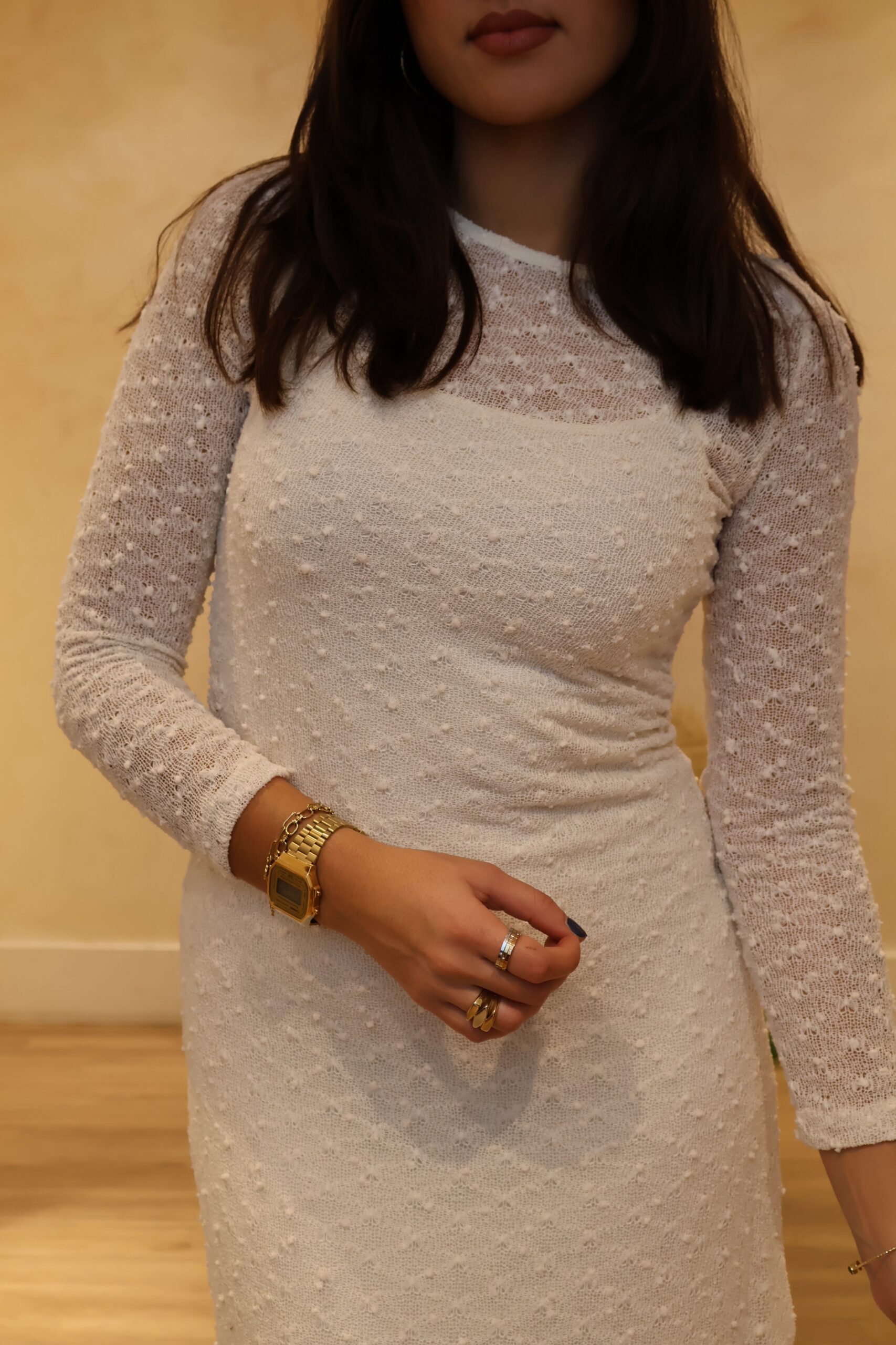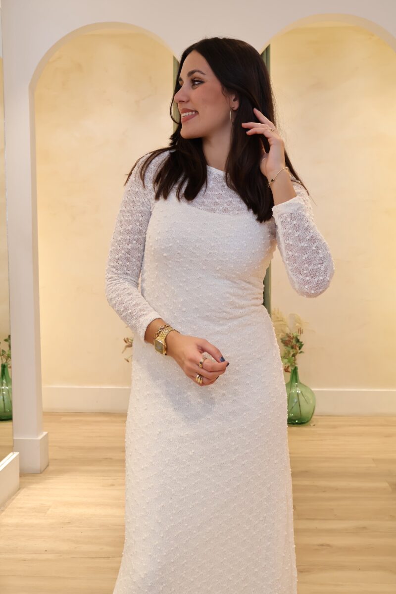 Vestido largo calado de plumeti con mangas largas, detalles en la cintura de frunce quedando ajustado .Vestido de licra interior de tirantas.