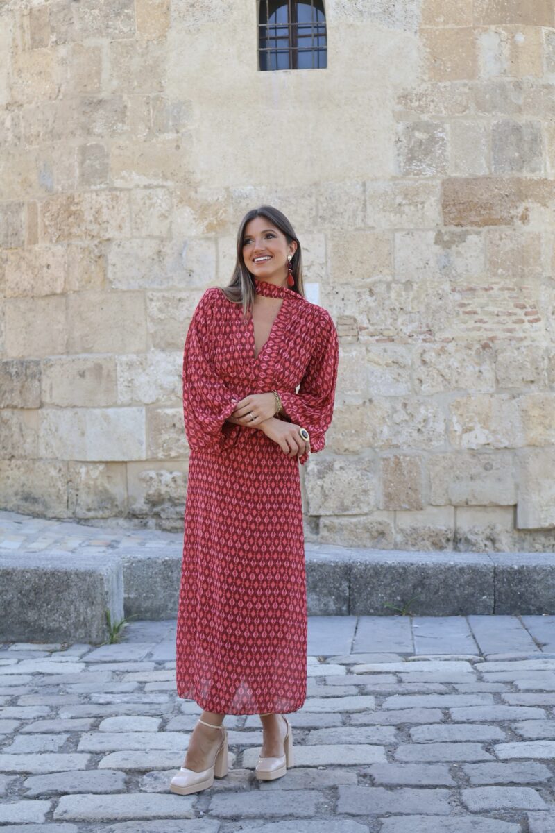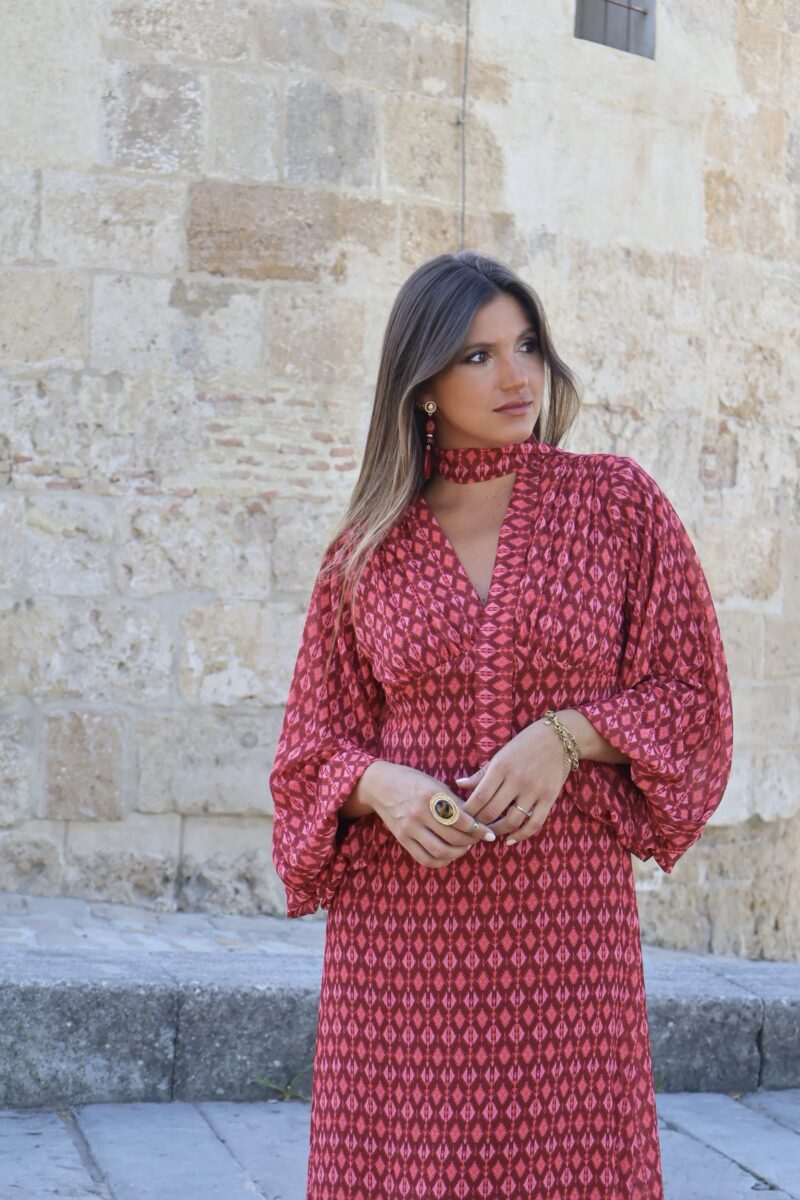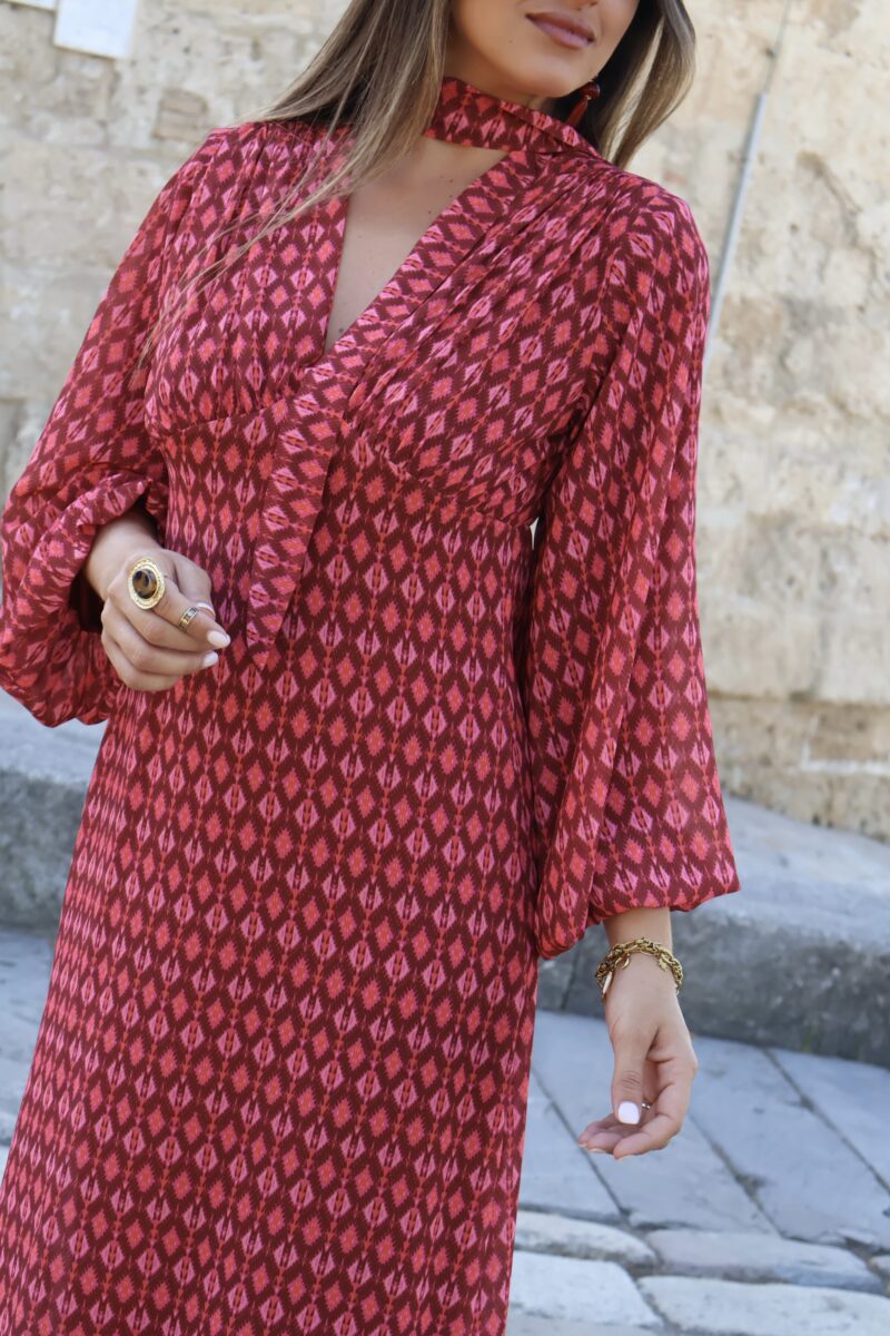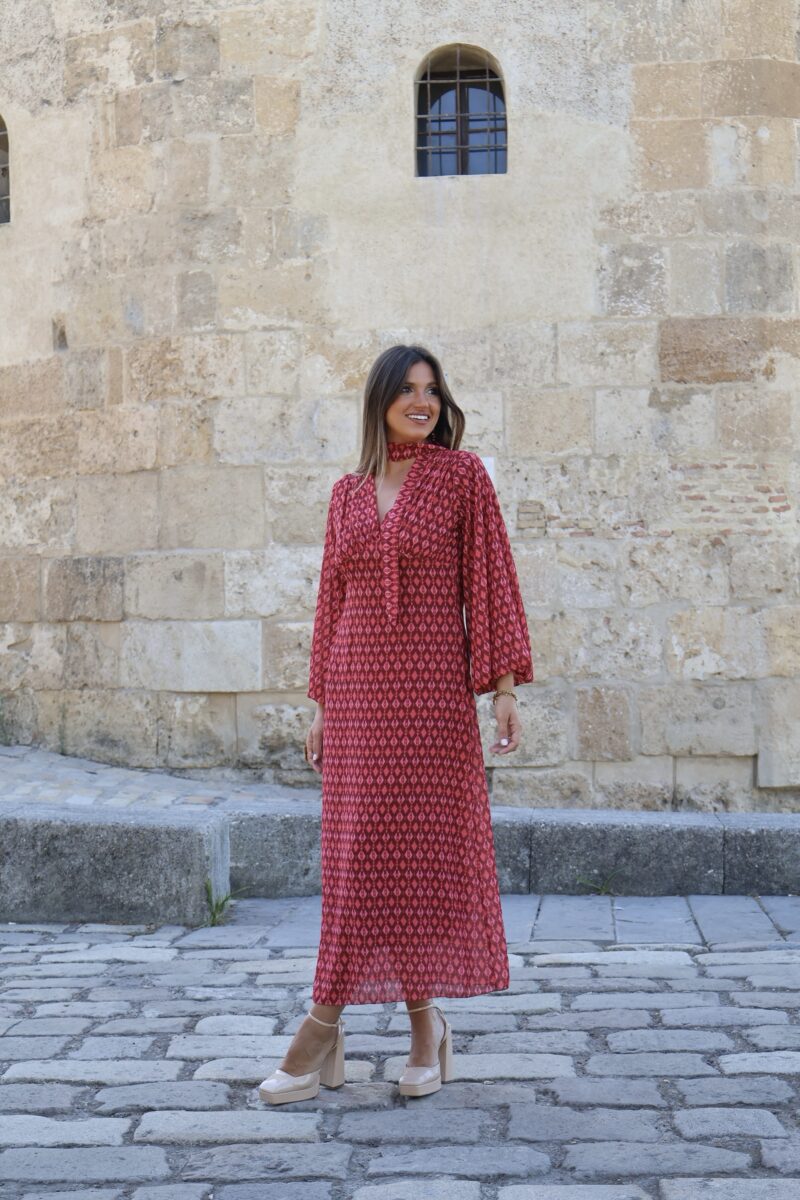 Vestido gasa forrado por dentro con chocker de lazada. Escote de pico y detalle de hombreras con mangas abullonadas. Cintura por detrás elástica. Corte midi.