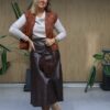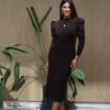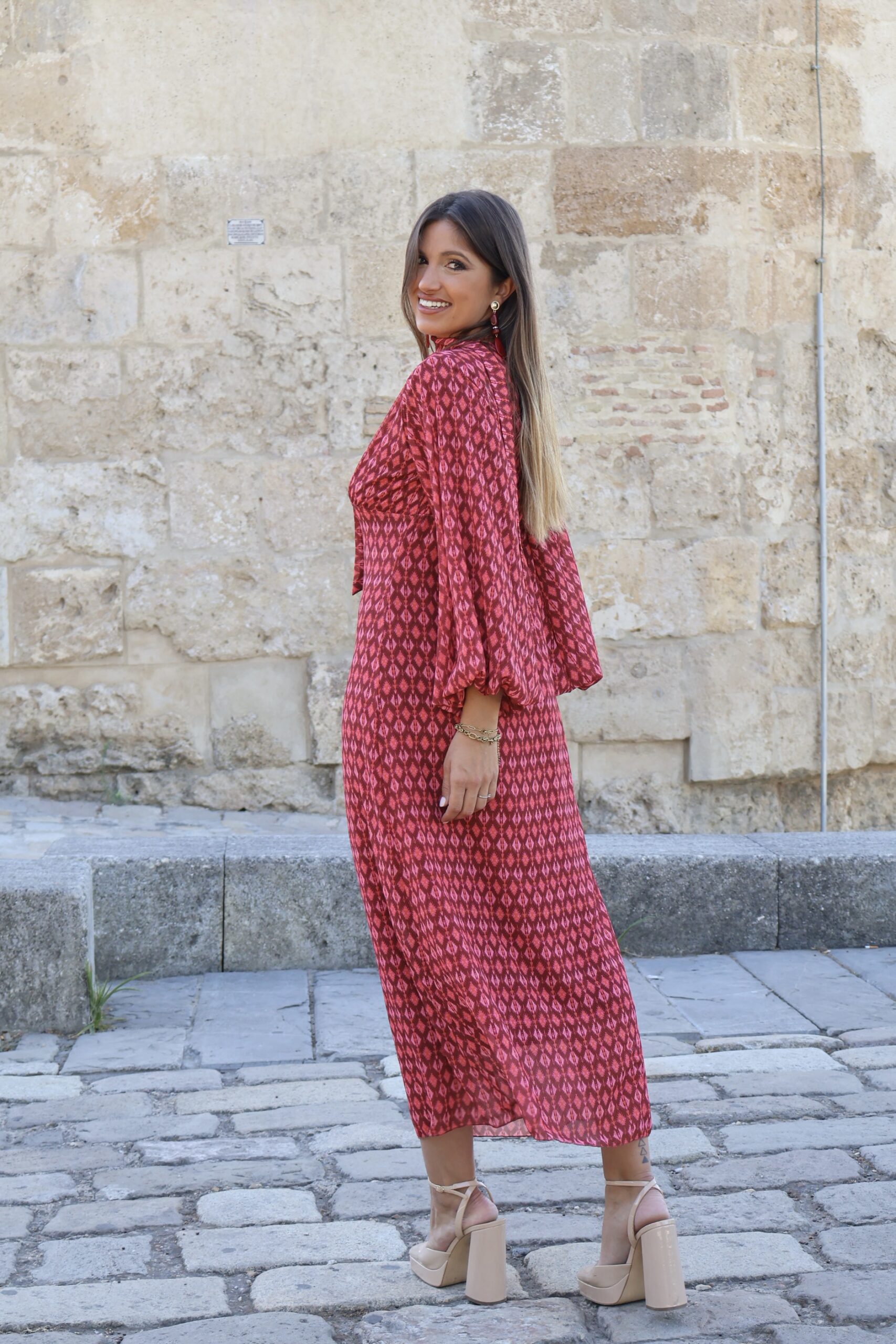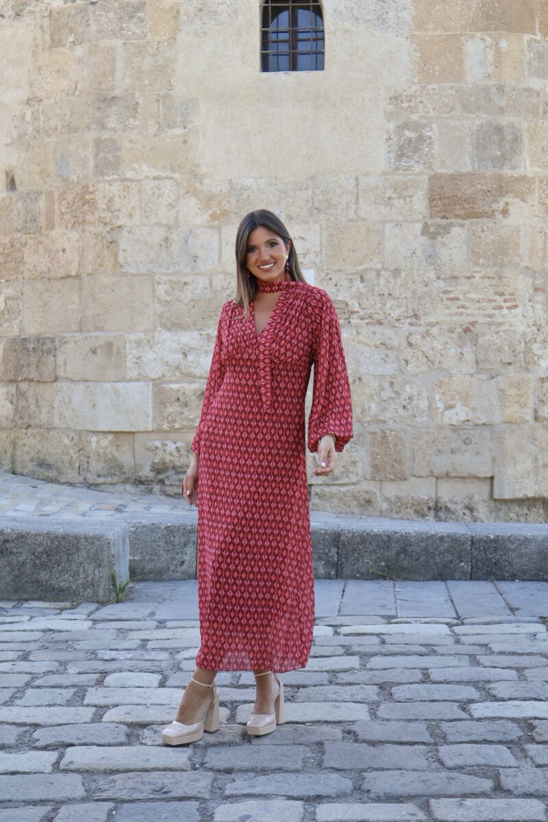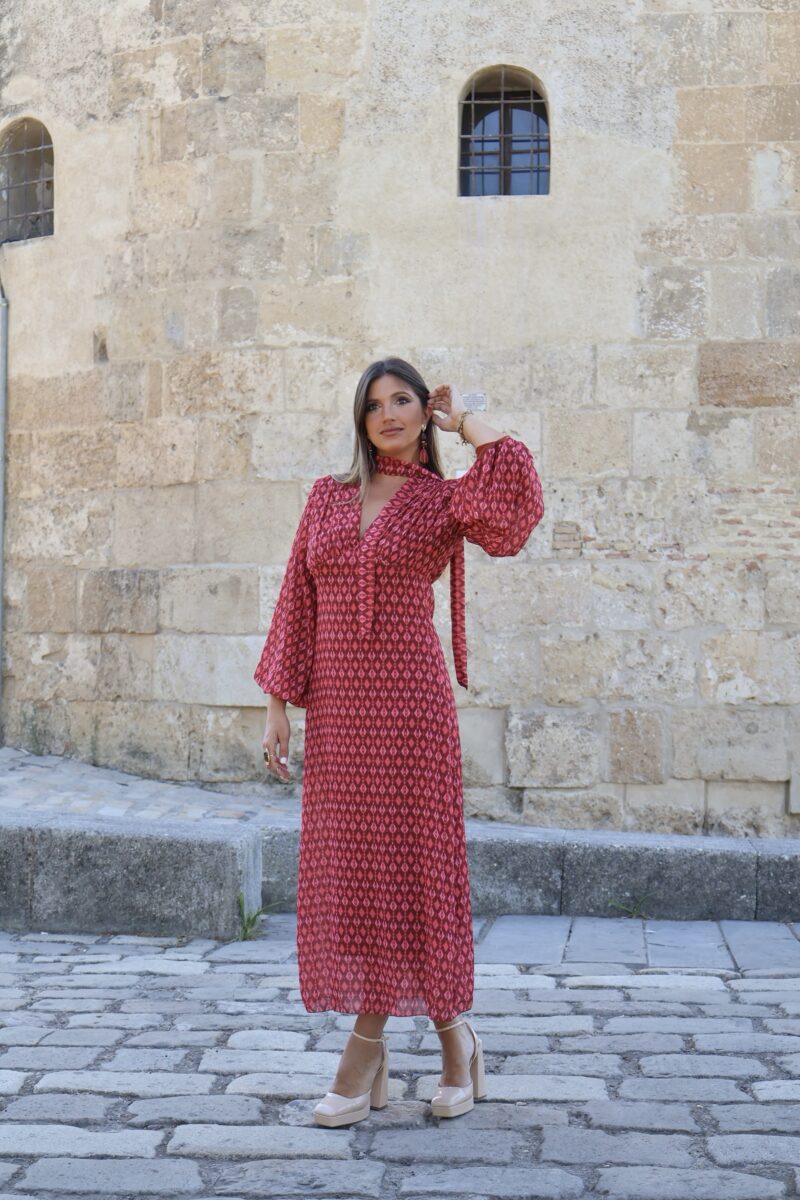 Vestido gasa forrado por dentro con chocker de lazada. Escote de pico y detalle de hombreras con mangas abullonadas. Cintura por detrás elástica. Corte midi.