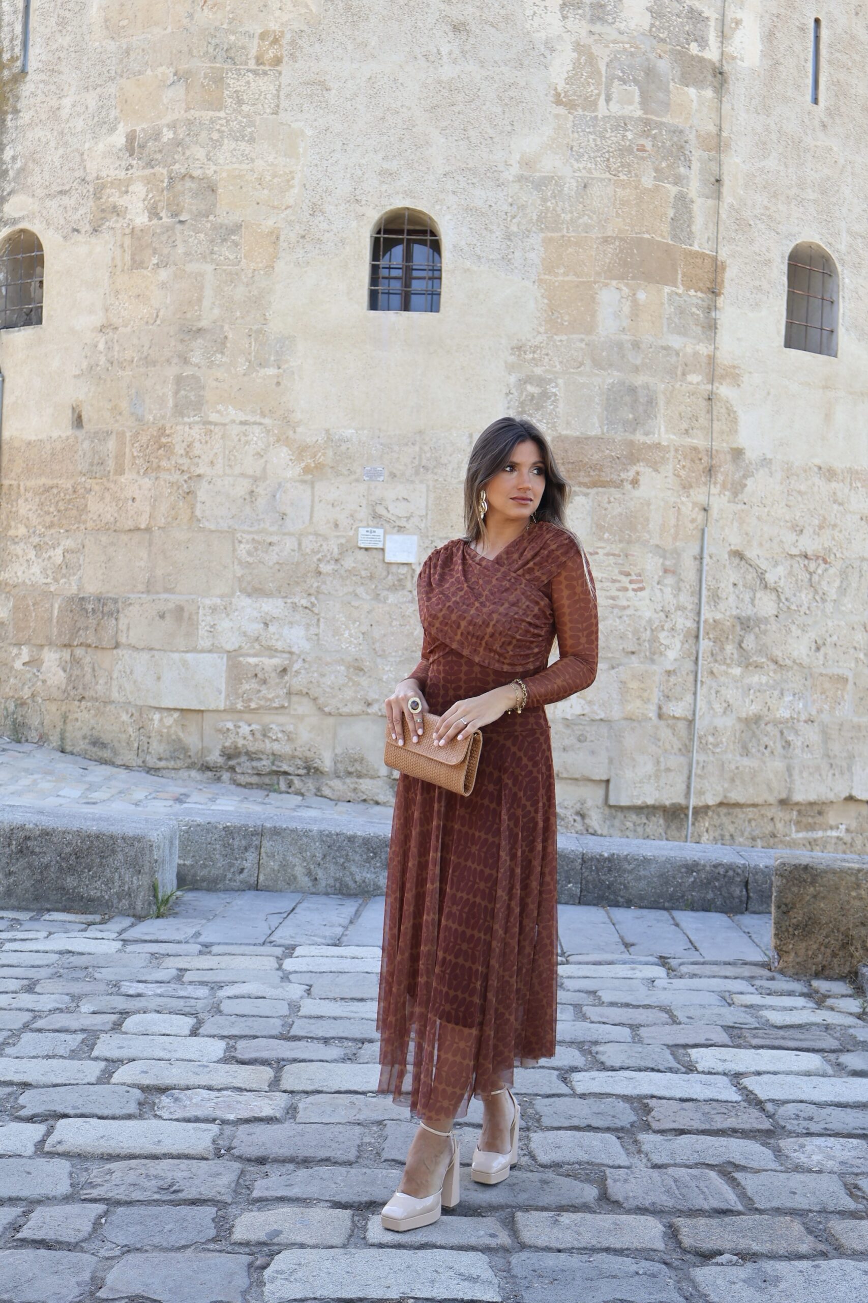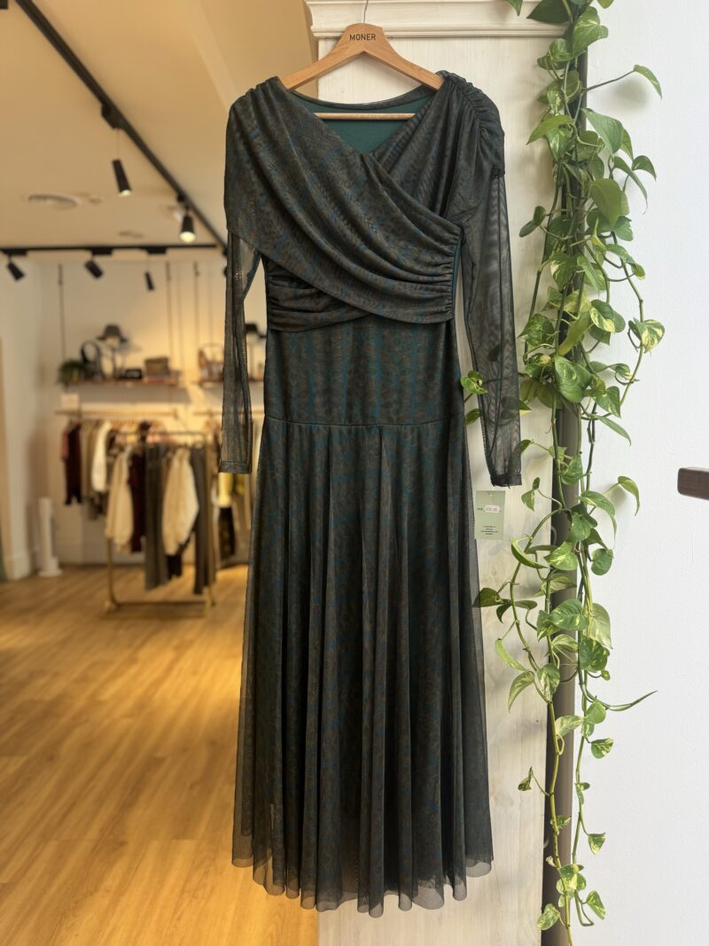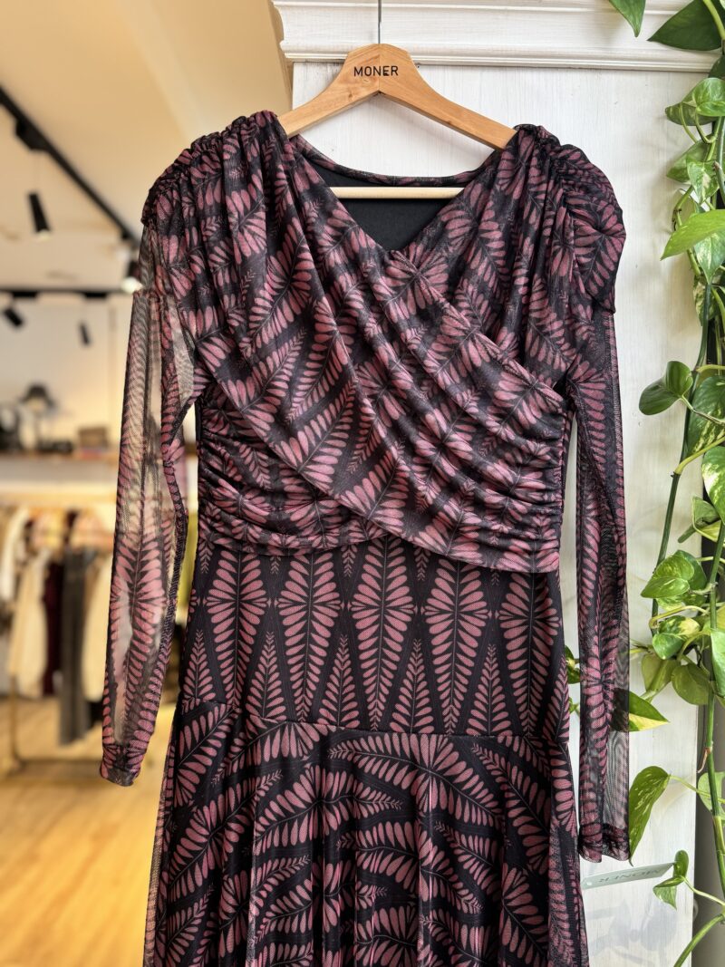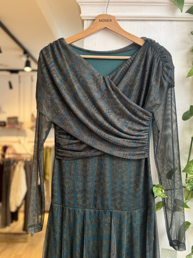 Vestido de tul con manga larga pegada transparente. Escote cruzado. Corte a la cadera efecto falda con vuelo.