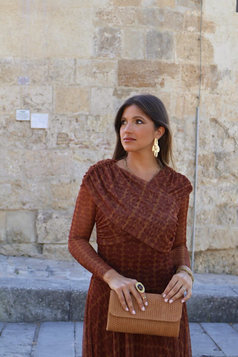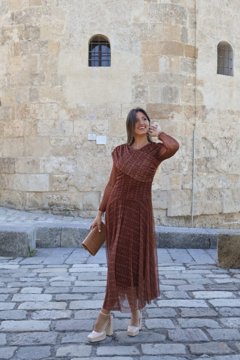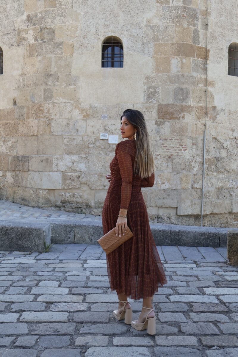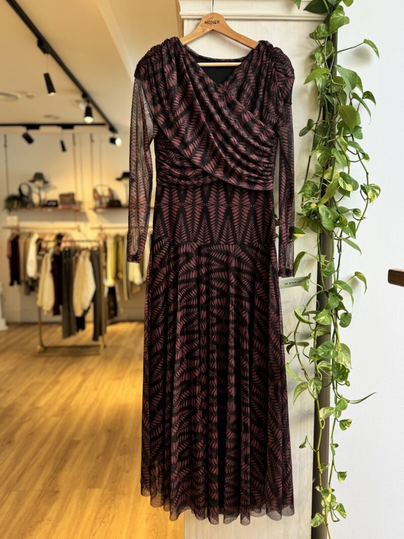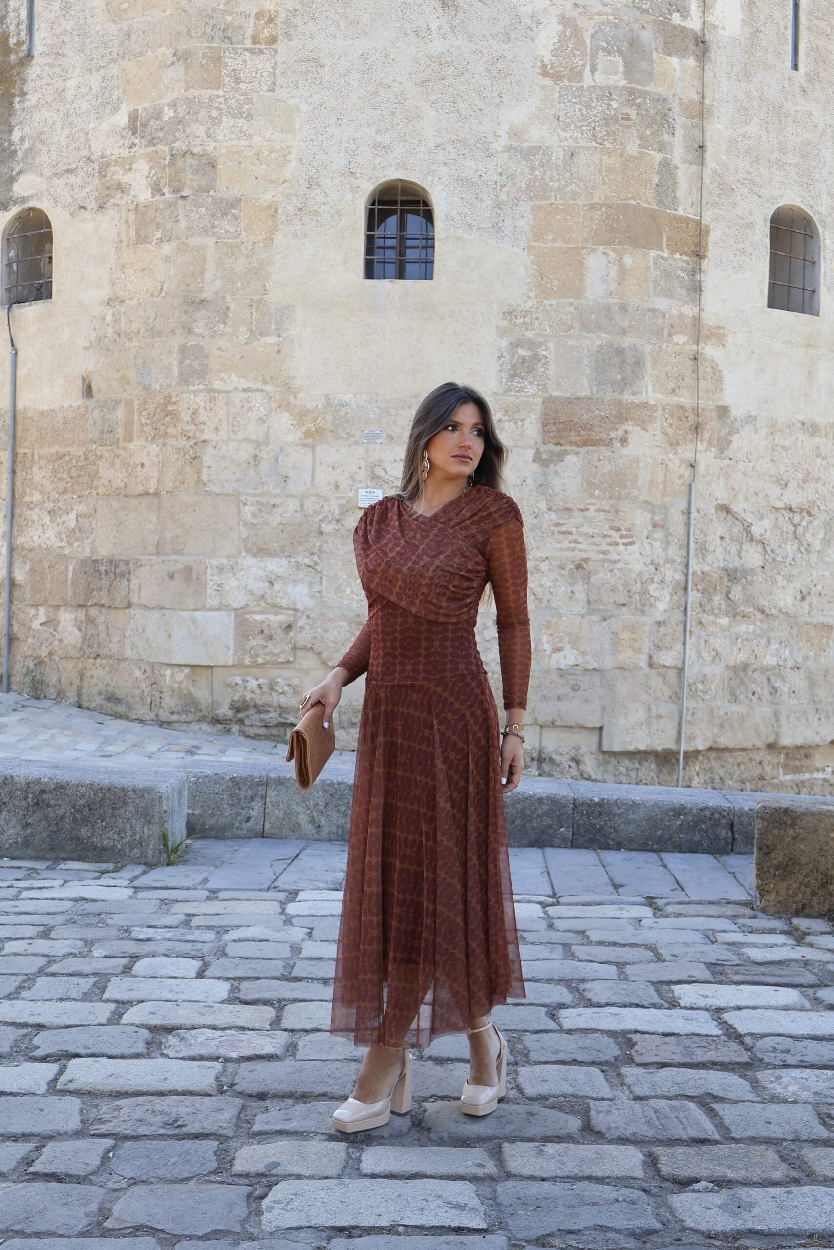 Vestido de tul con manga larga pegada transparente. Escote cruzado. Corte a la cadera efecto falda con vuelo.